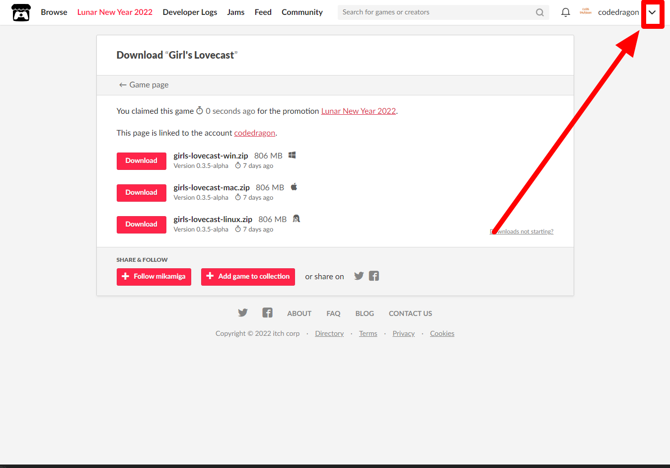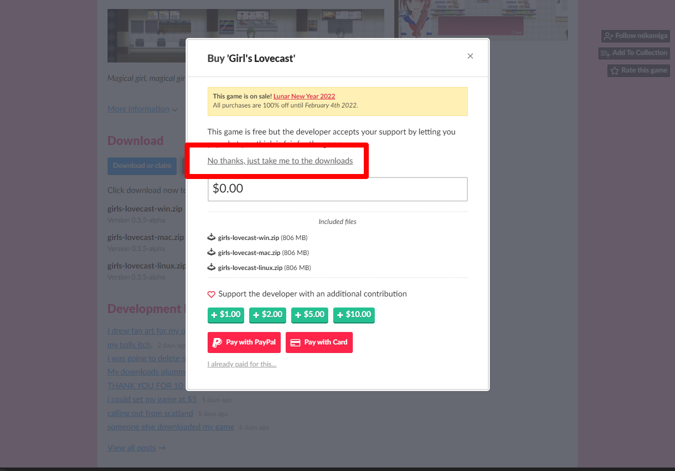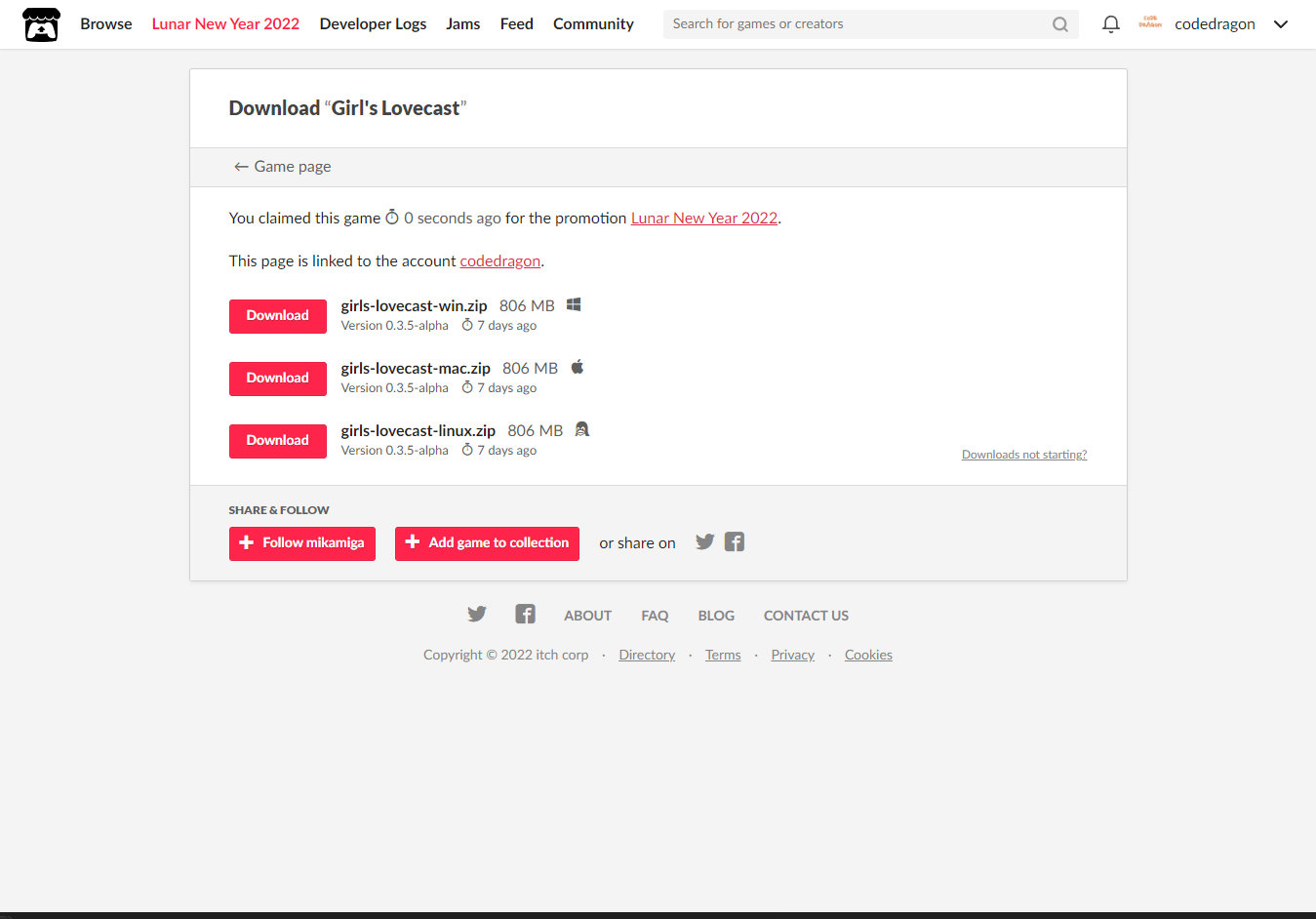 [Claim game]을 클릭하면 "Girl's Lovecast" 게임이 나의 게임 라이브러리에 추가되고 설치파일을 다운받을 수 있는 페이지로 이동됩니다.