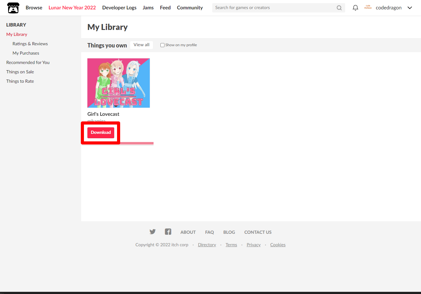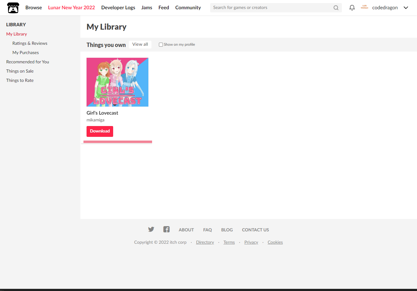 "My Lirary"에서 방금 받은 "Girl's Lovecast" 게임 항목을 확인할 수 있습니다.