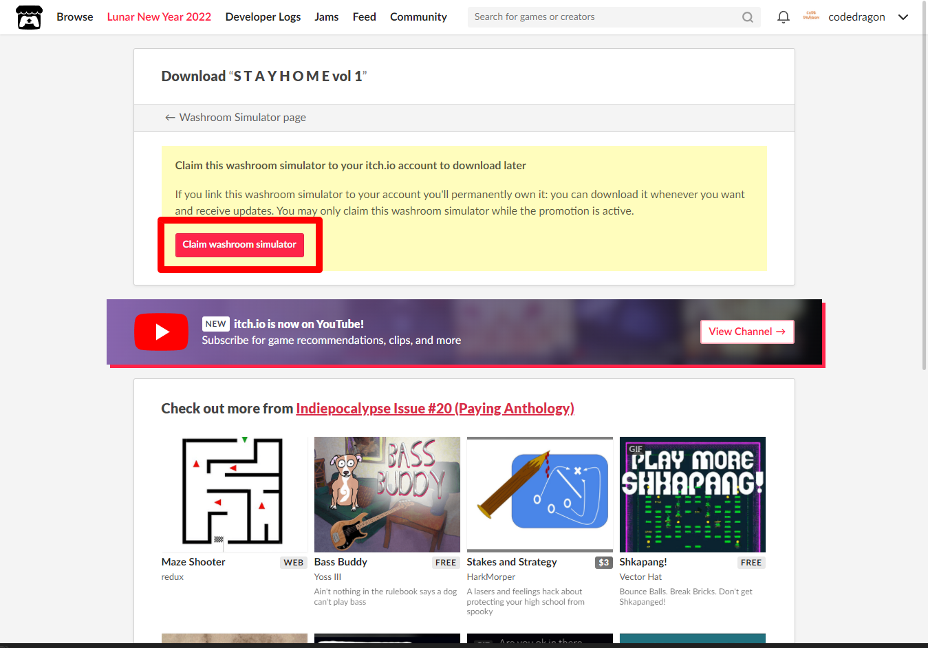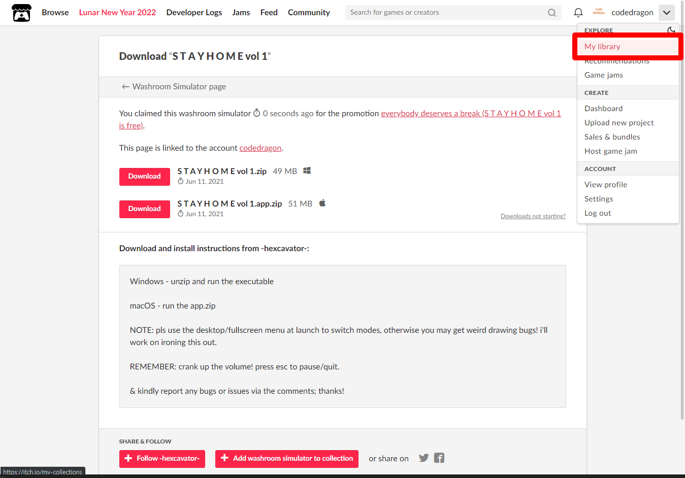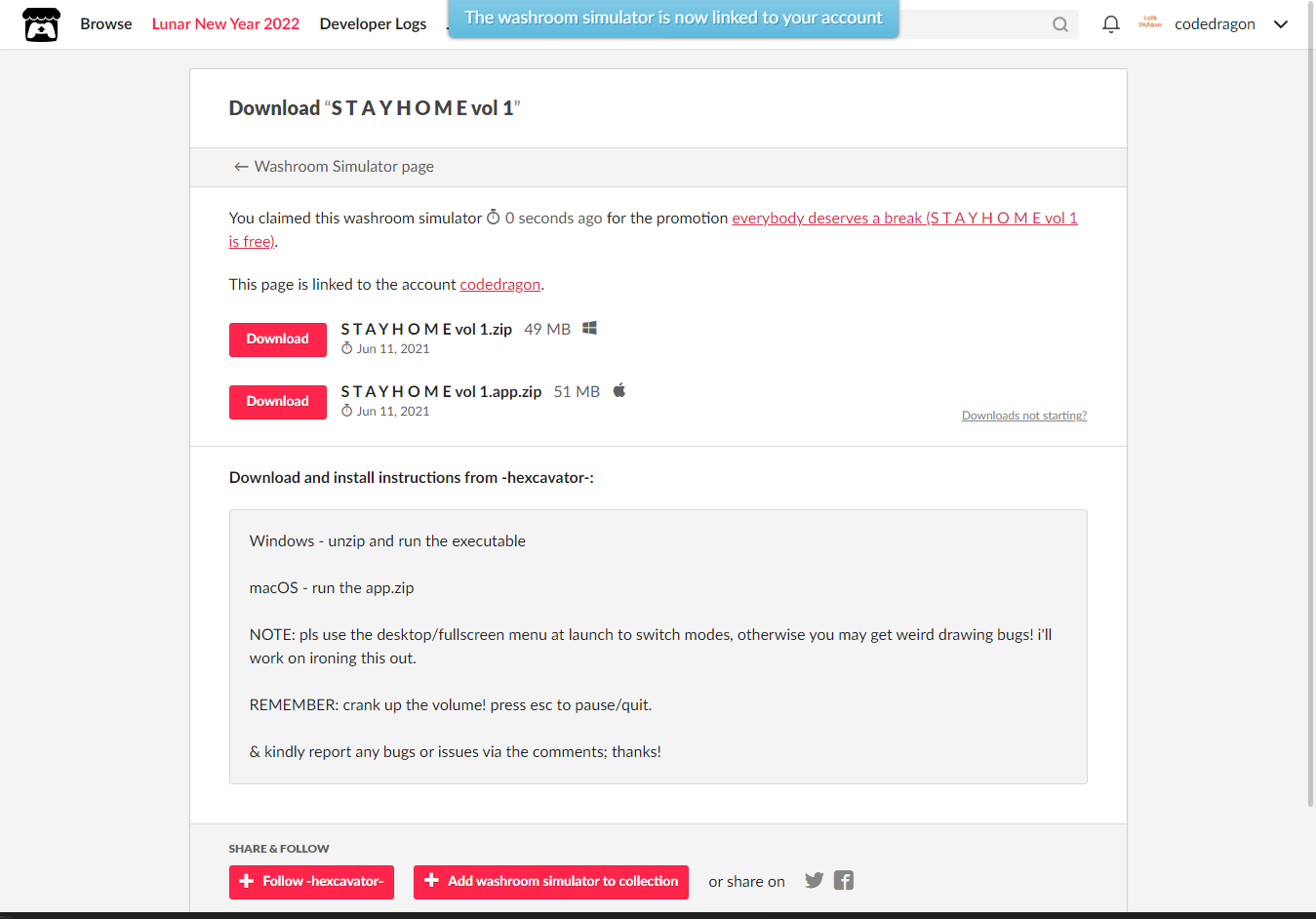 [Claim washroom simulator]을 클릭하면 "S T A Y H O M E vol 1" 게임이 나의 게임 라이브러리에 추가되고 설치파일을 다운받을 수 있는 페이지로 이동됩니다.