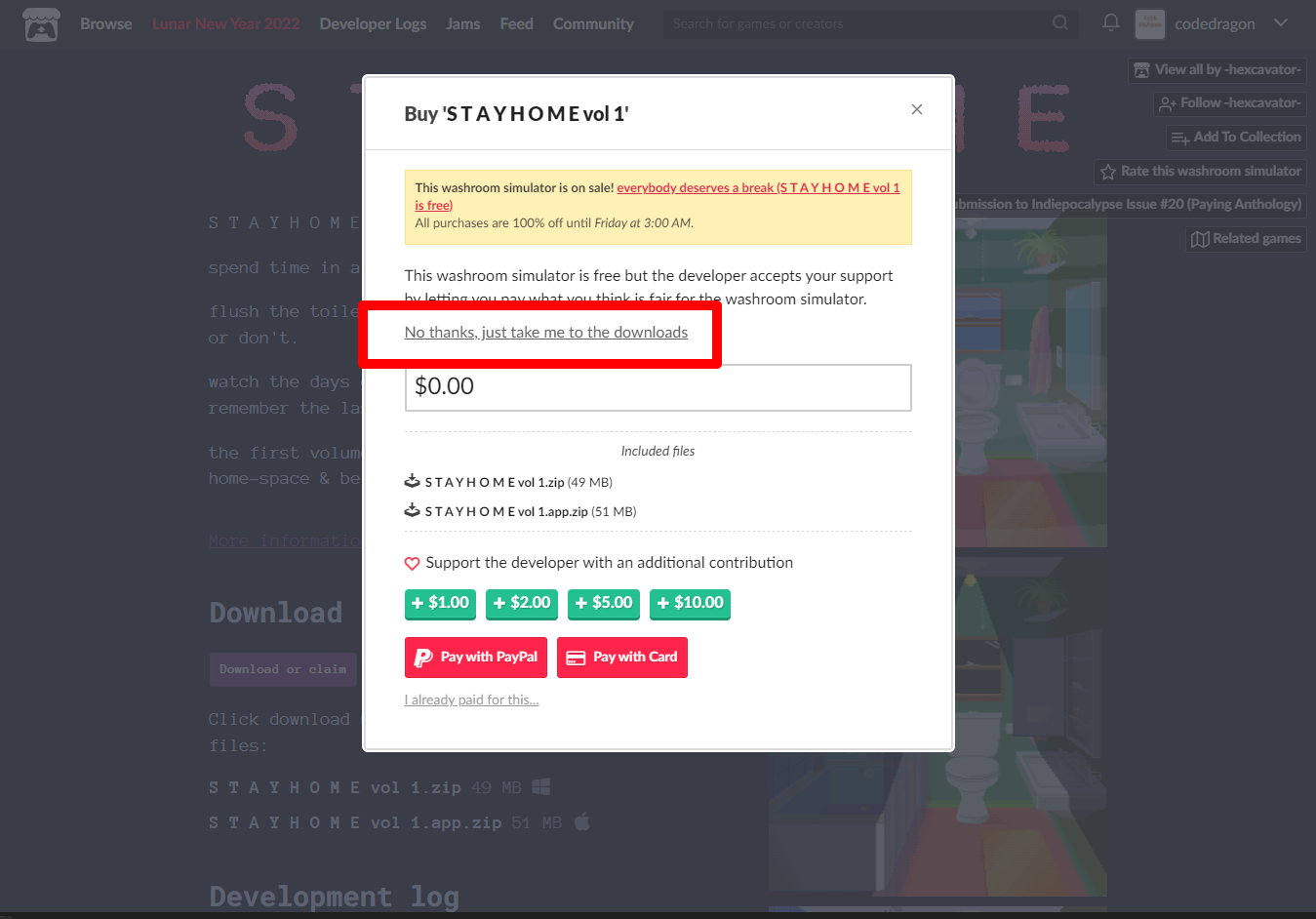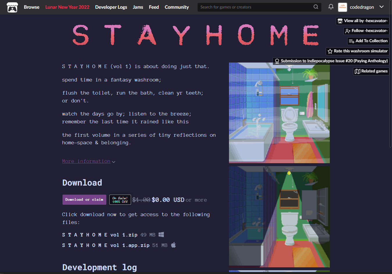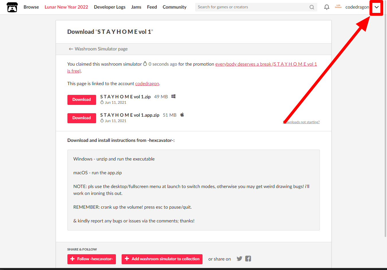 [Claim washroom simulator]을 클릭하면 "S T A Y H O M E vol 1" 게임이 나의 게임 라이브러리에 추가되고 설치파일을 다운받을 수 있는 페이지로 이동됩니다.