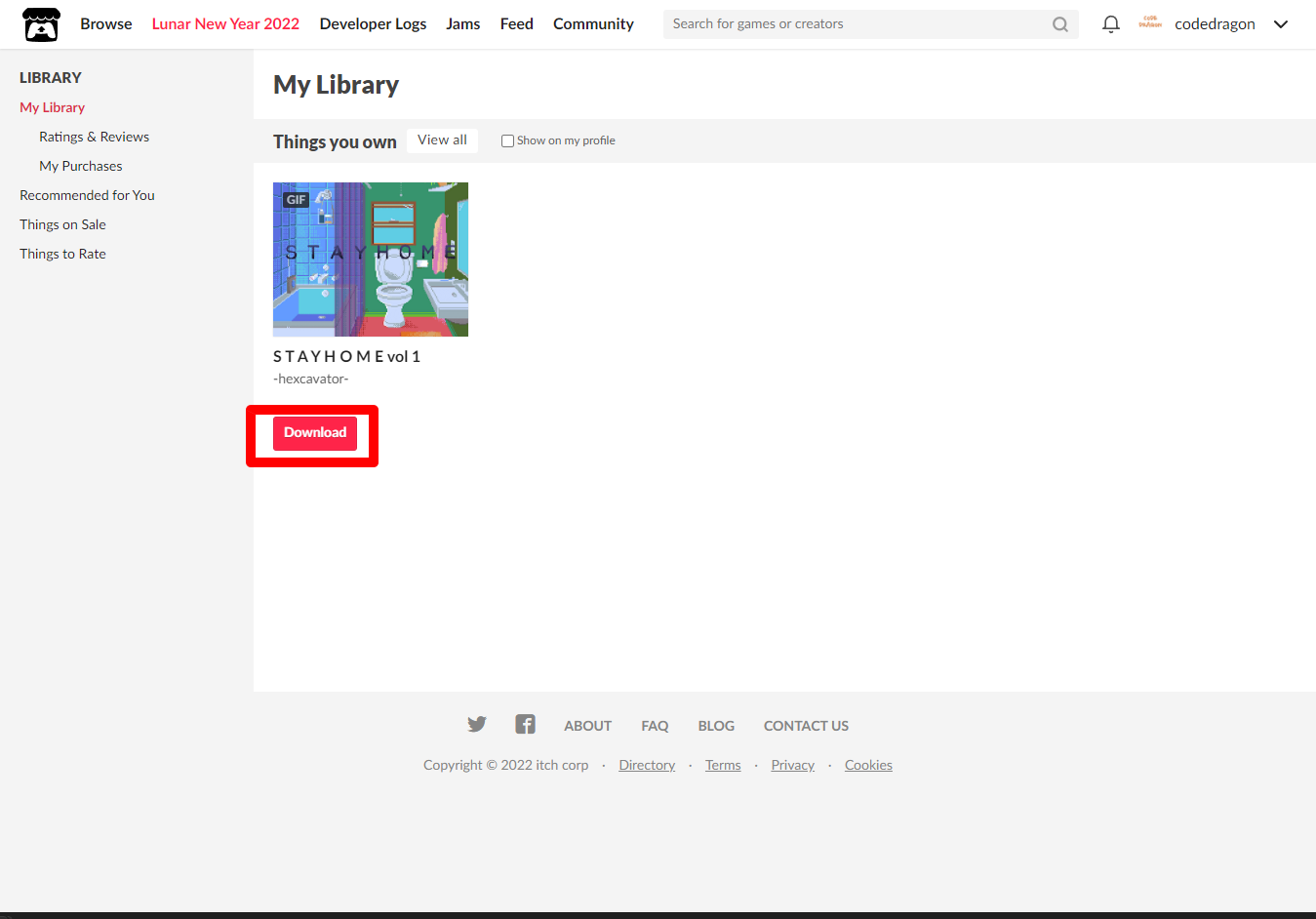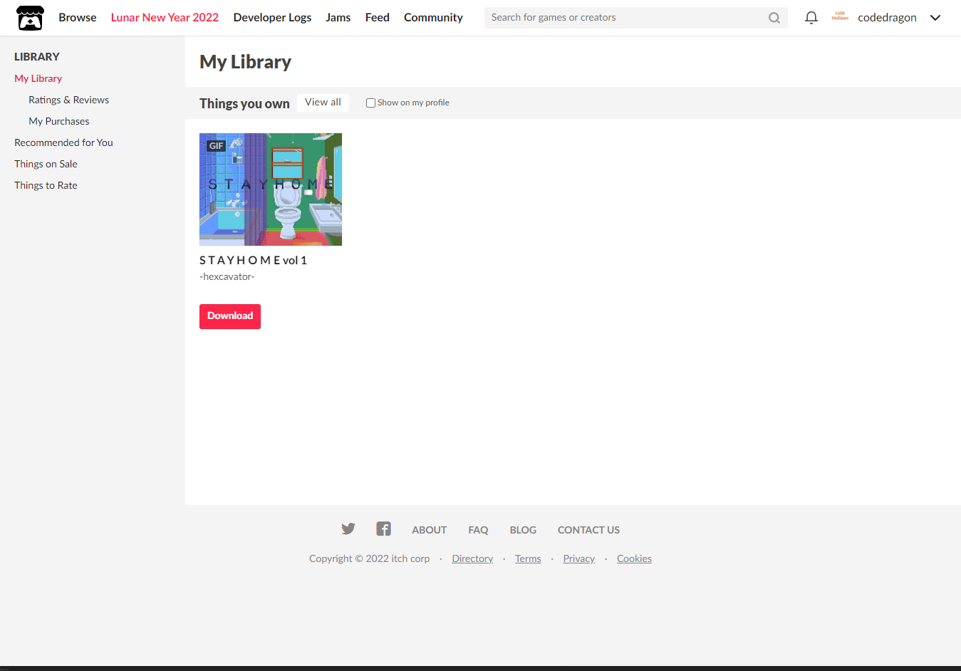 "My Lirary"에서 방금 받은 "S T A Y H O M E vol 1" 게임 항목을 확인할 수 있습니다.