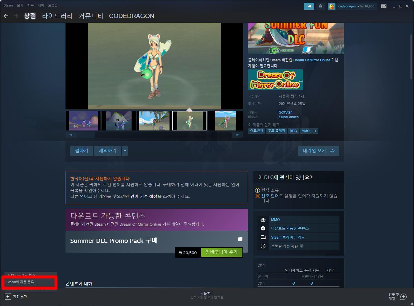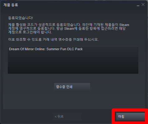 "Dream Of Mirror Online: Male Summer Fun DLC" 게임명이 표시되고 등록이 완료됩니다.