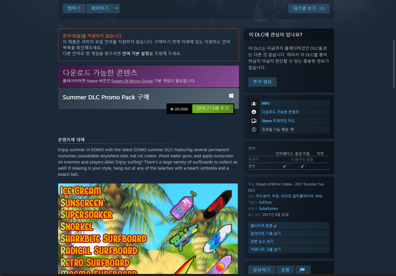 "Dream Of Mirror Online: Male Summer Fun DLC" 게임 페이지 (DLC)