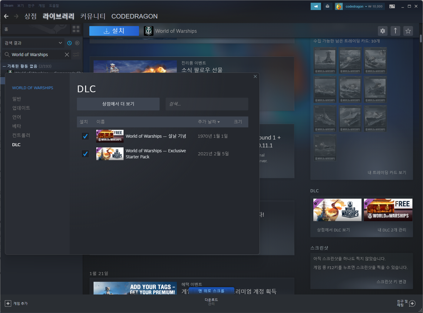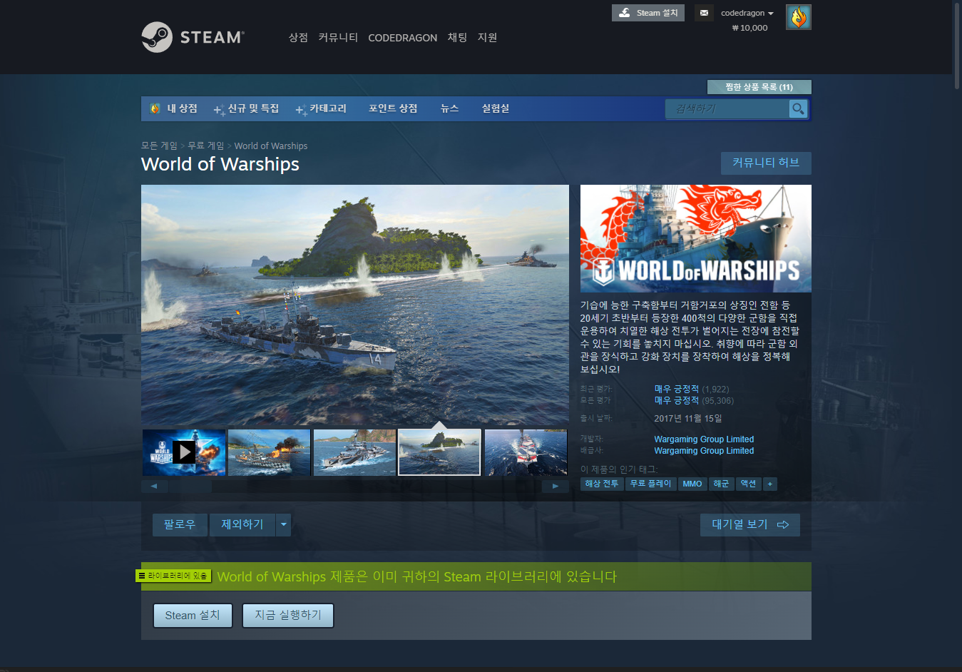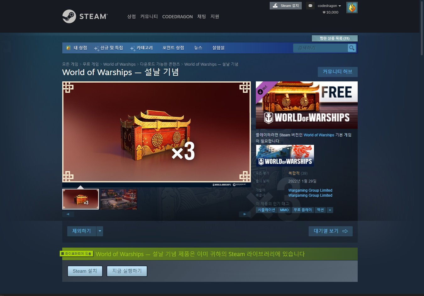 다시 "World of Warships — 설날 기념" 게임페이지로 돌아와 보면 녹색으로 게임라이브러리에 추가되었음을 확인할 수 있습니다.
