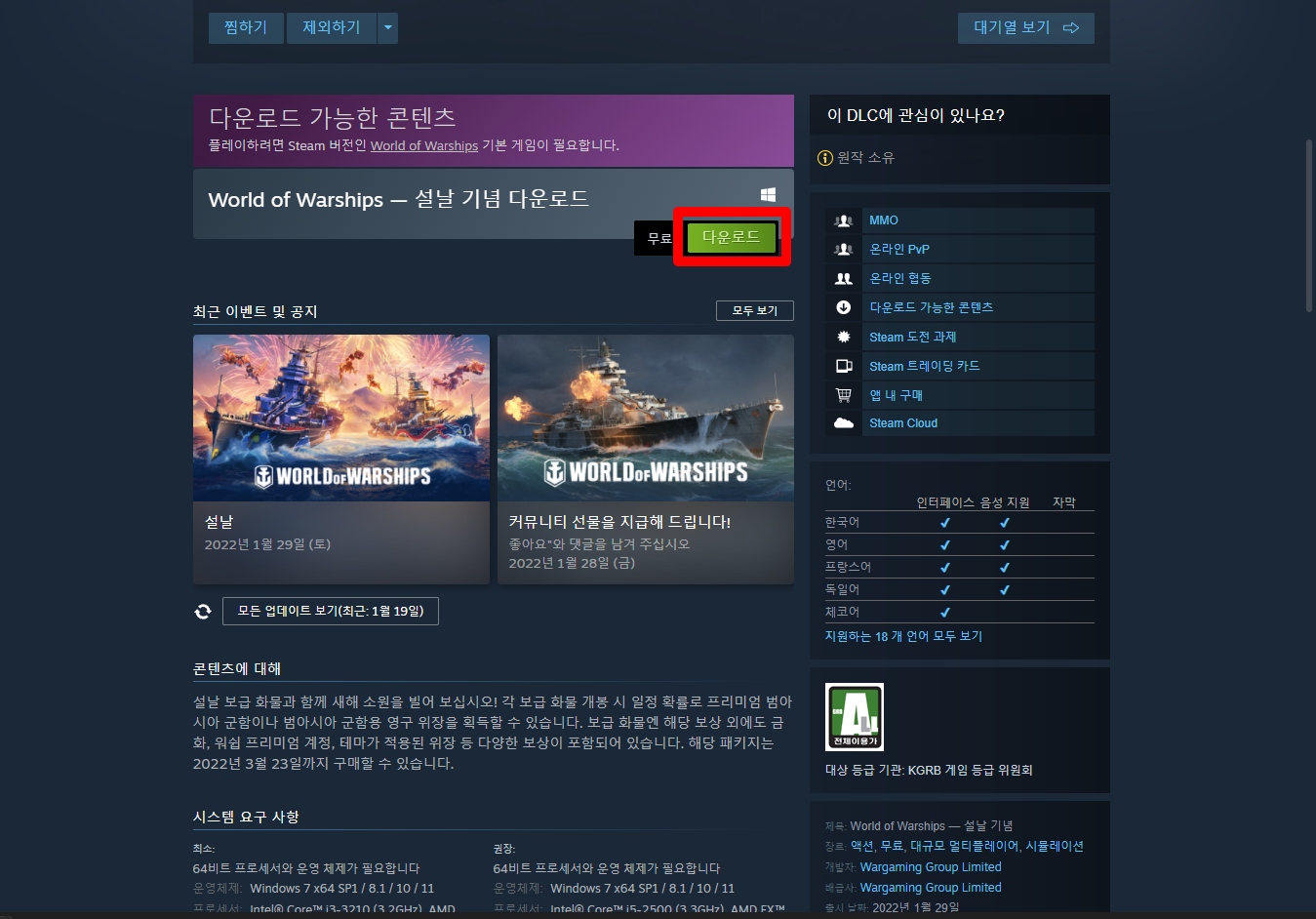 "World of Warships — 설날 기념" 게임페이지를 조금 내려준 후 [다운로드] 버튼을 클릭하면 게임라이브러리에 추가됩니다.