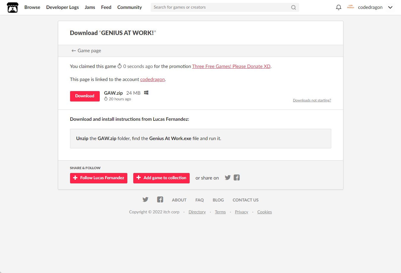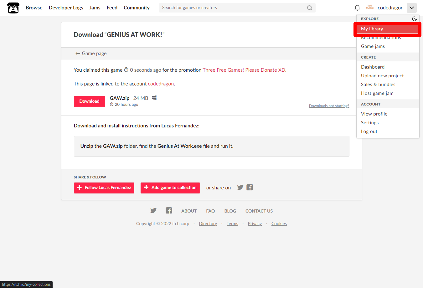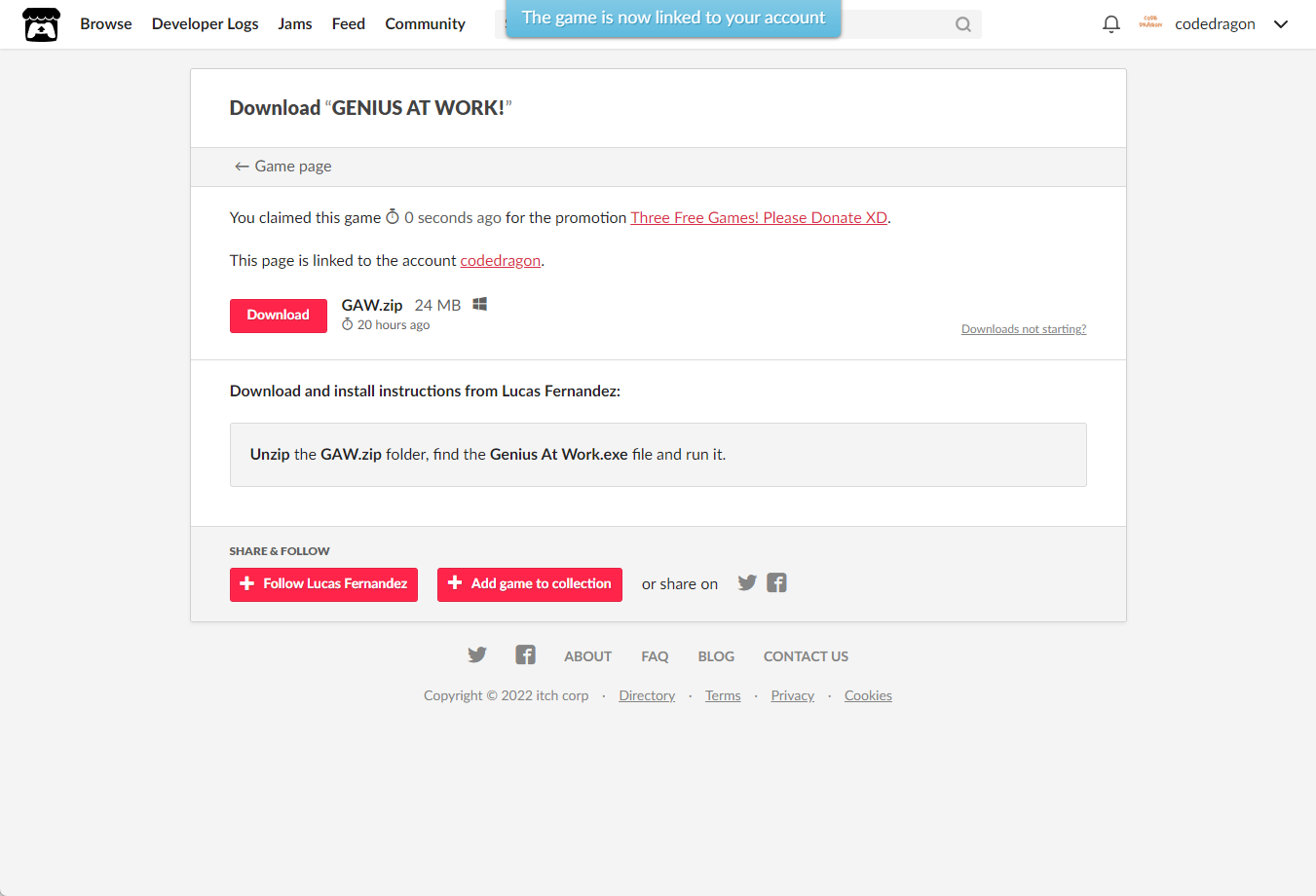 [Claim game]을 클릭하면 "GENIUS AT WORK!" 게임이 나의 게임 라이브러리에 추가되고 설치파일을 다운받을 수 있는 페이지로 이동됩니다.