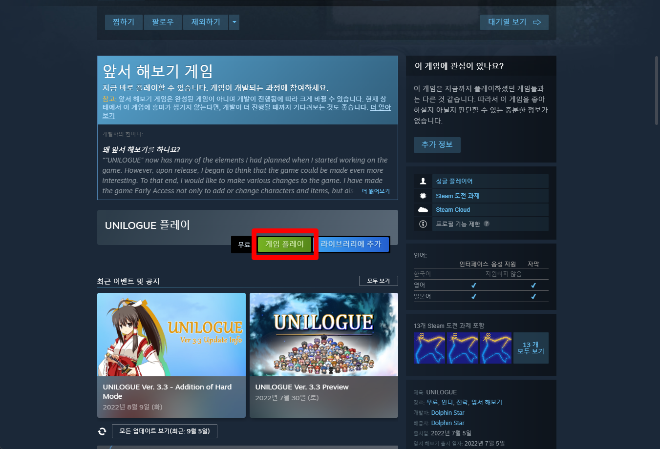 "UNILOGUE" 페이지를 내려 [게임 플레이]를 클릭하면 됩니다.