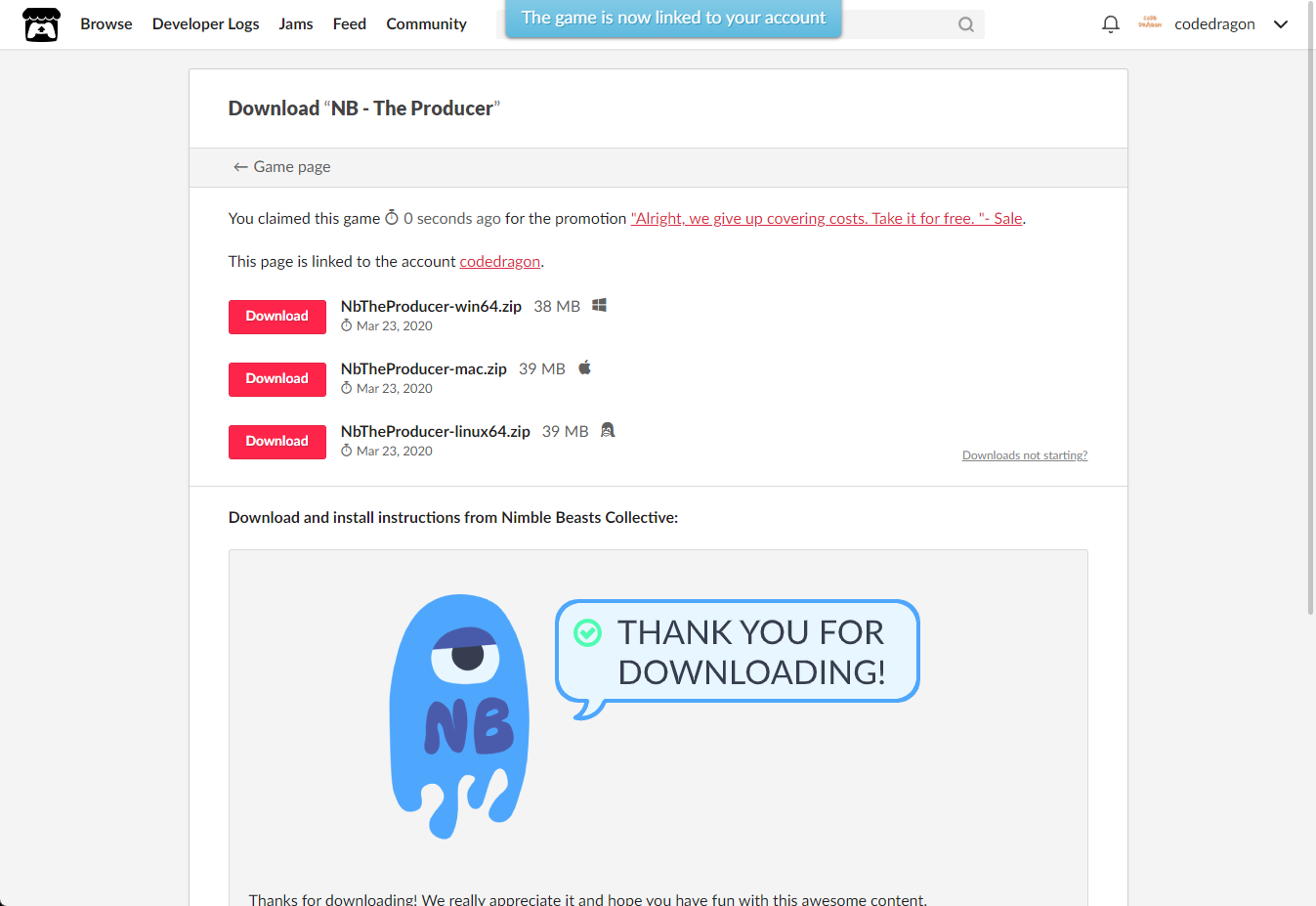 [Claim game]을 클릭하면 "NB - The Producer" 게임이 나의 게임 라이브러리에 추가되고 설치파일을 다운받을 수 있는 페이지로 이동됩니다.