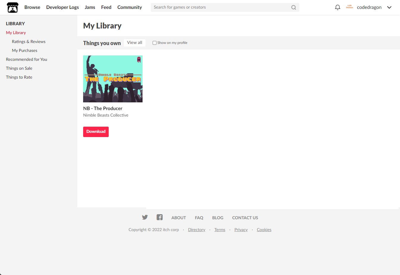 [Claim game]을 클릭하면 "NB - The Producer" 게임이 나의 게임 라이브러리에 추가되고 설치파일을 다운받을 수 있는 페이지로 이동됩니다.
