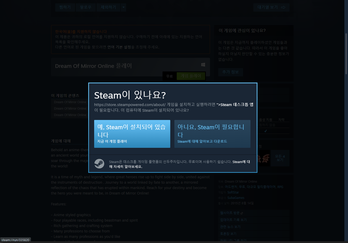 스팀런처 실행이 끝나면 원하는 위치에 "Dream Of Mirror Online" 설치를 완료해 줍니다.