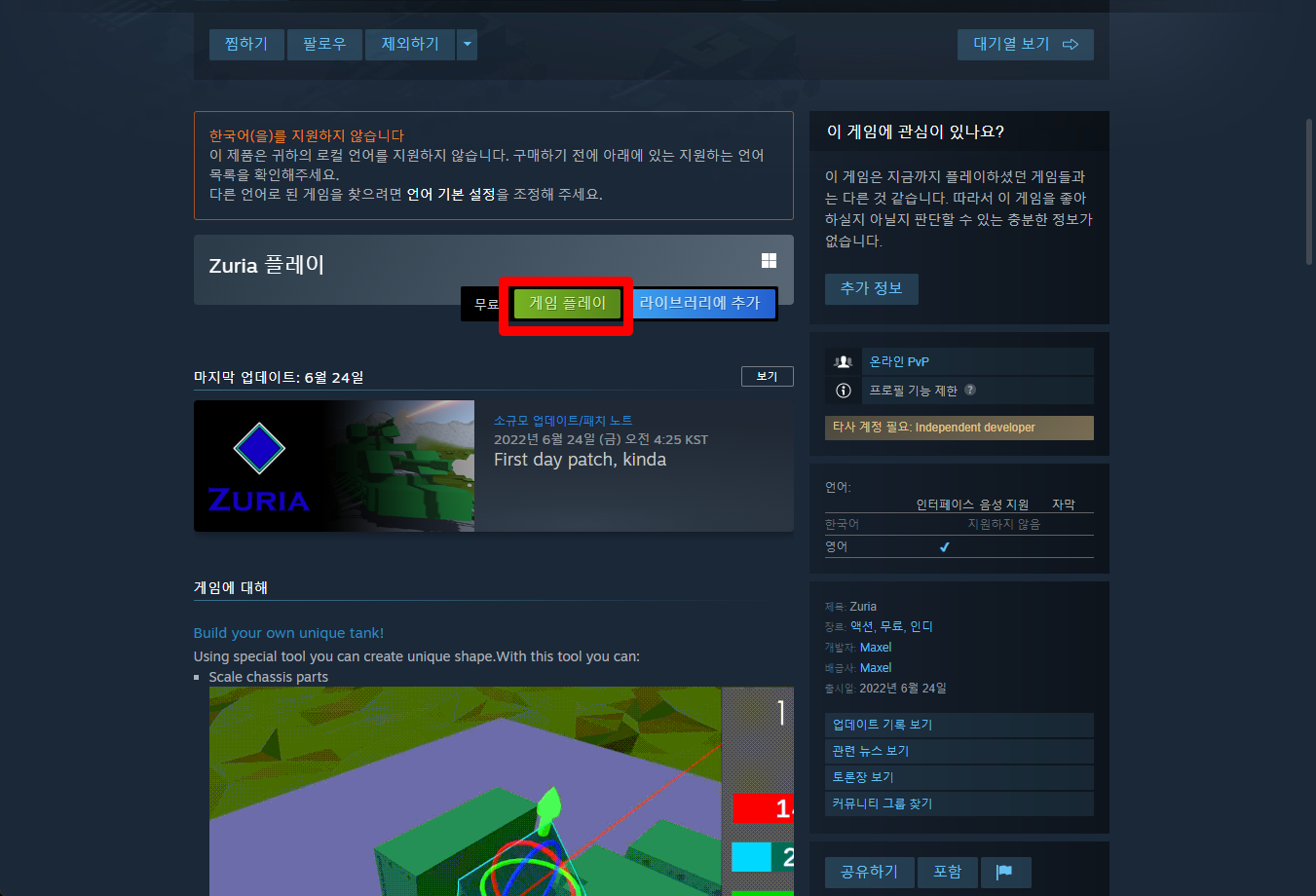"Zuria" 페이지를 내려 [게임 플레이]를 클릭하면 됩니다.
