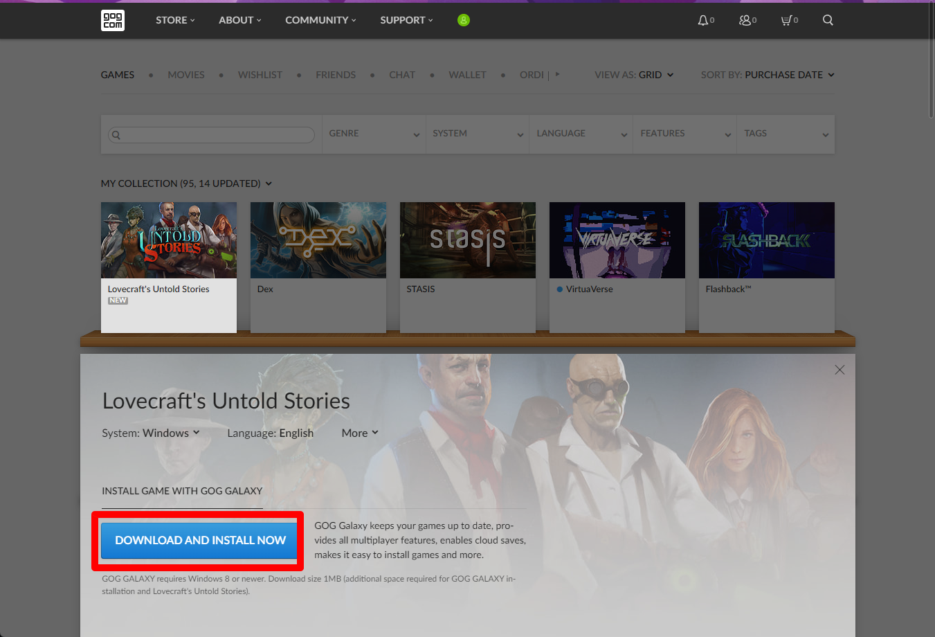 해당 항목을 클릭한 후 나오는 "Lovecraft's Untold Stories" 게임 페이지에서 [DOWONLOAD AND INSTALL NOW] 버튼을 클릭해서 "Lovecraft's Untold Stories" 설치파일을 다운로드할 수 있습니다.