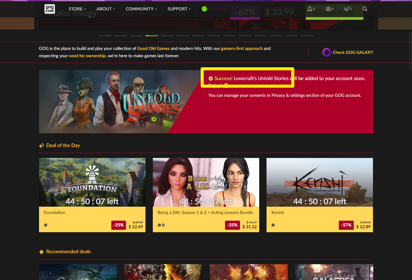 "Success!"로 나오면 나의 게임 라이브러리에 "Lovecraft's Untold Stories"가 추가됩니다.