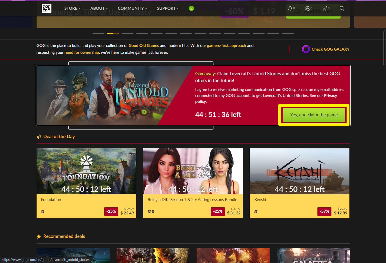 "Lovecraft's Untold Stories" 게임을 받기 위해 [Yes, and claim the game] 클릭합니다.