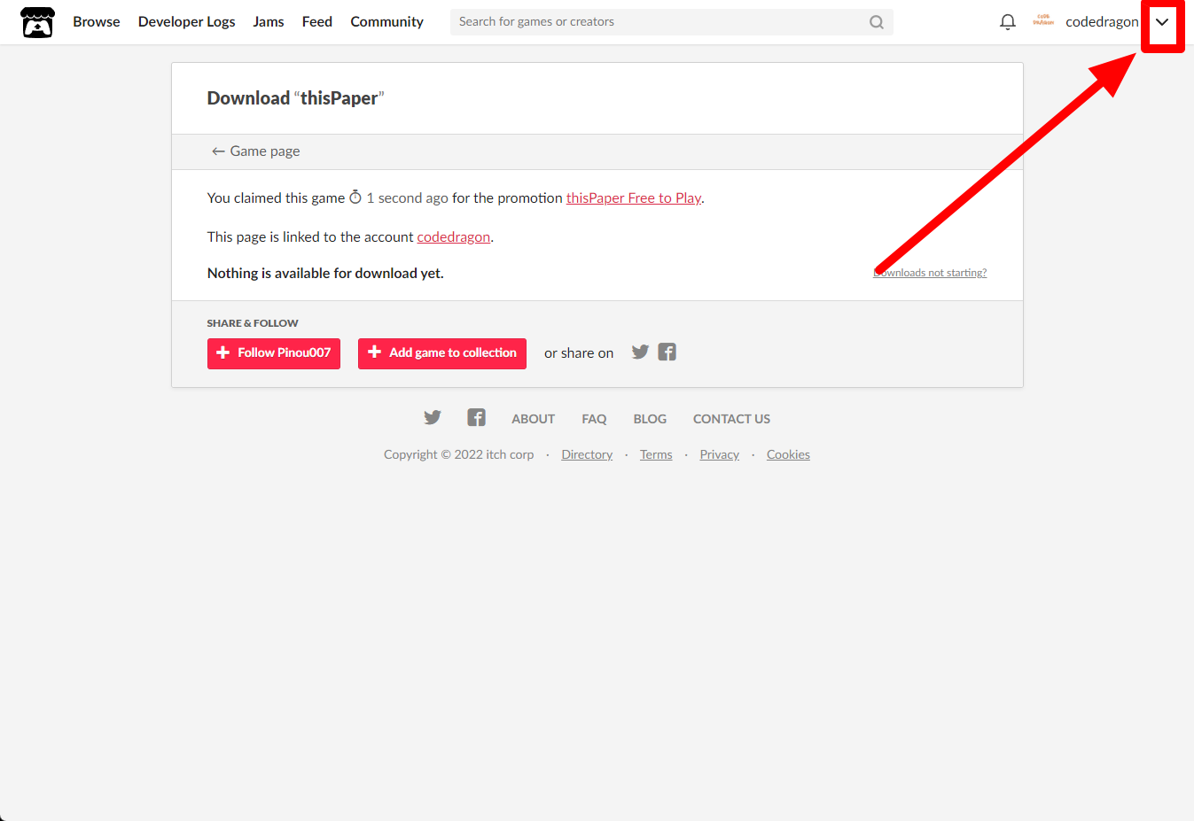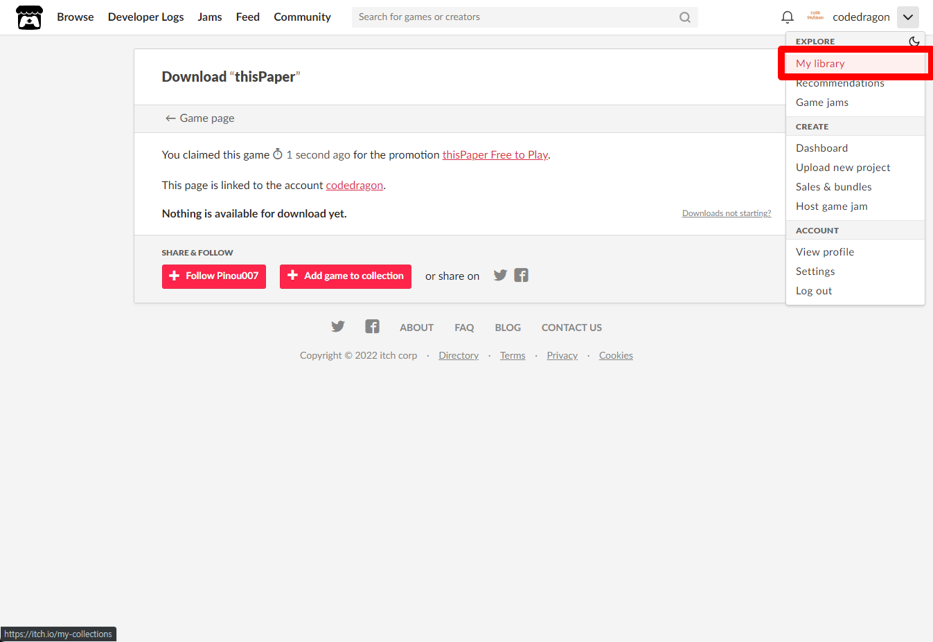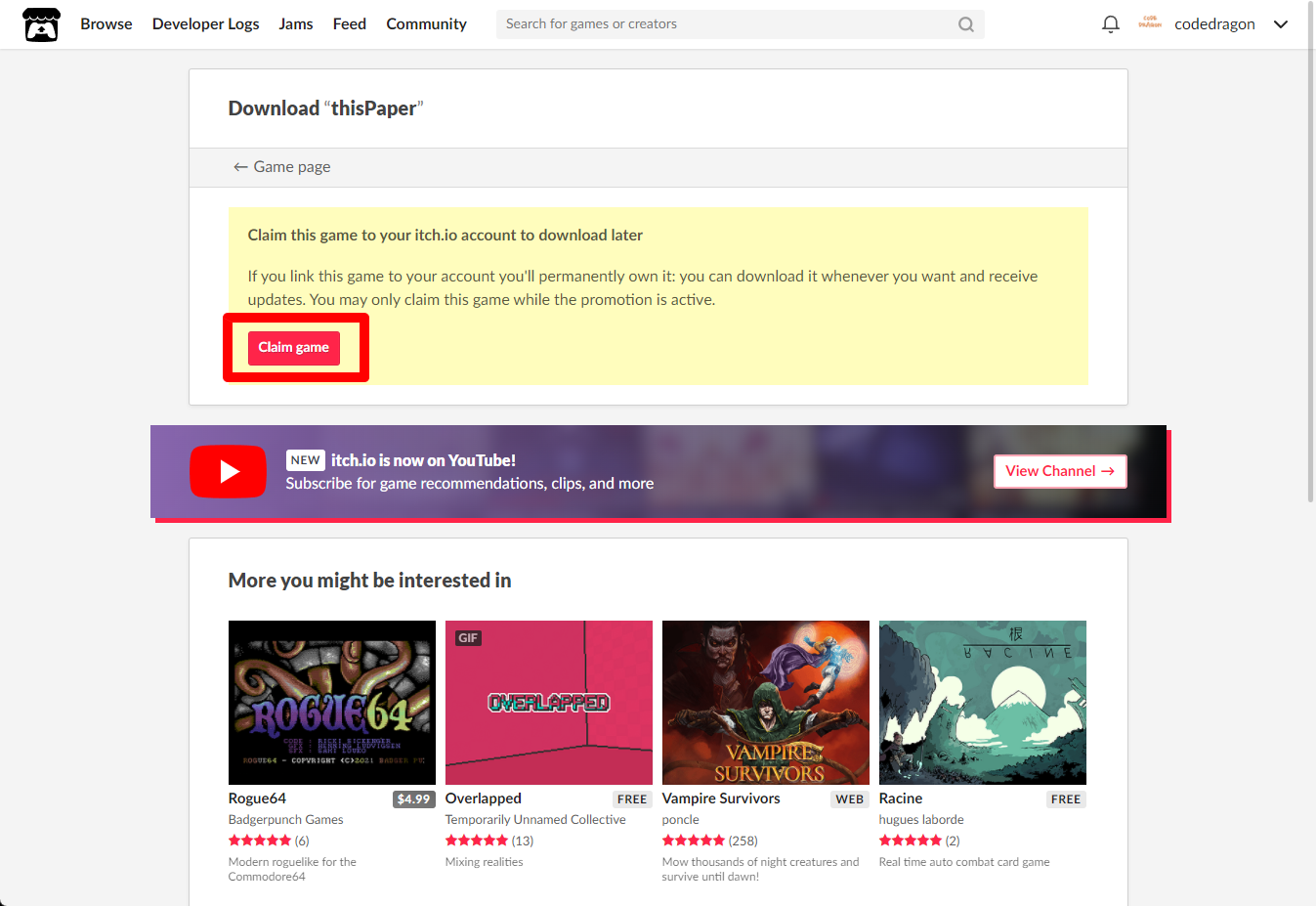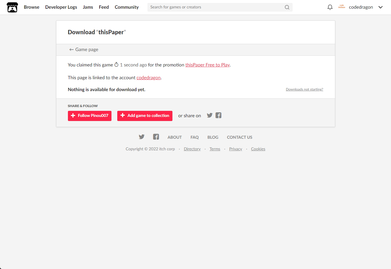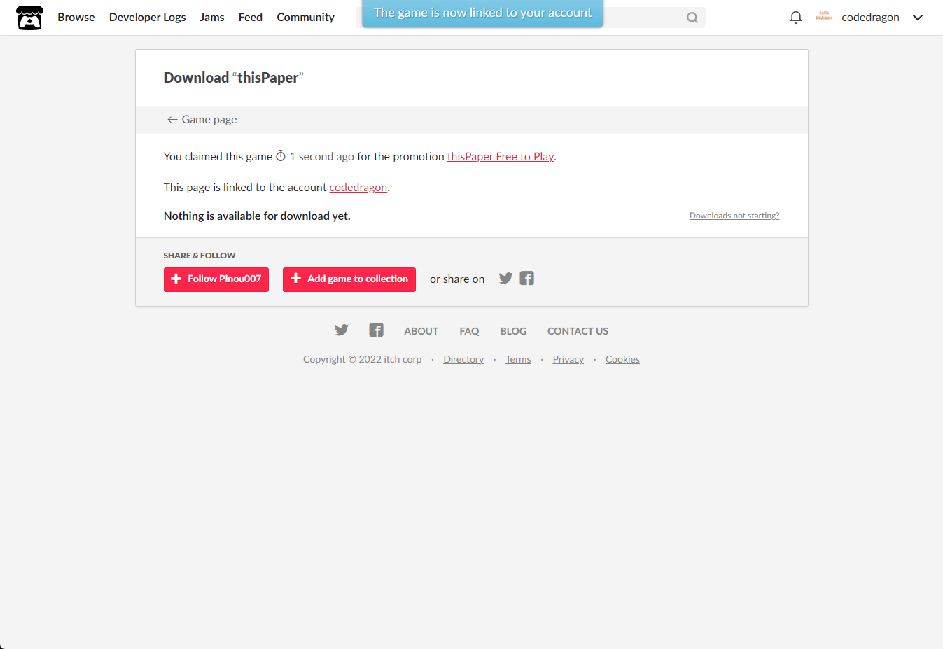 [Claim game]을 클릭하면 "thisPaper" 게임이 나의 게임 라이브러리에 추가되고 설치파일을 다운받을 수 있는 페이지로 이동됩니다.