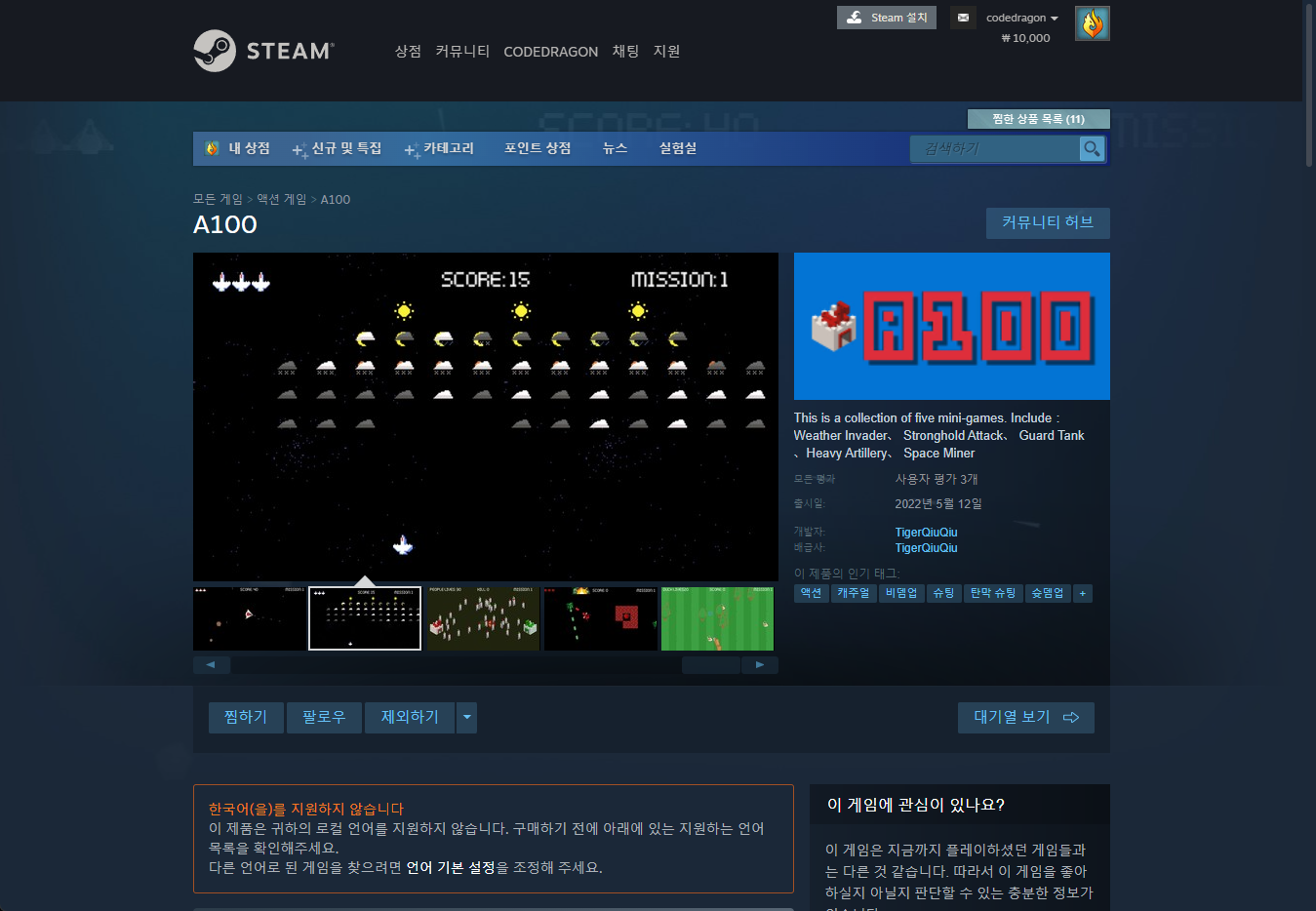 "A100" 스팀 페이지 입니다.