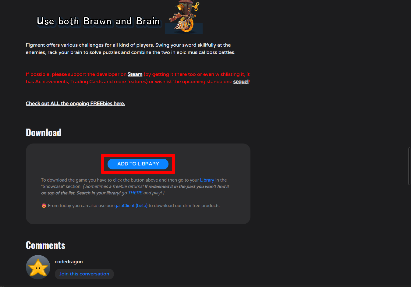 "Figment" 게임 페이지를 내려 [ADD TO LIBRARY]를 클릭합니다.