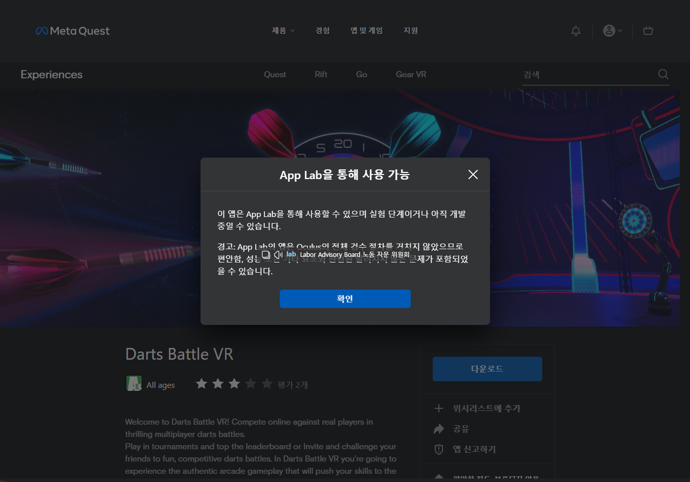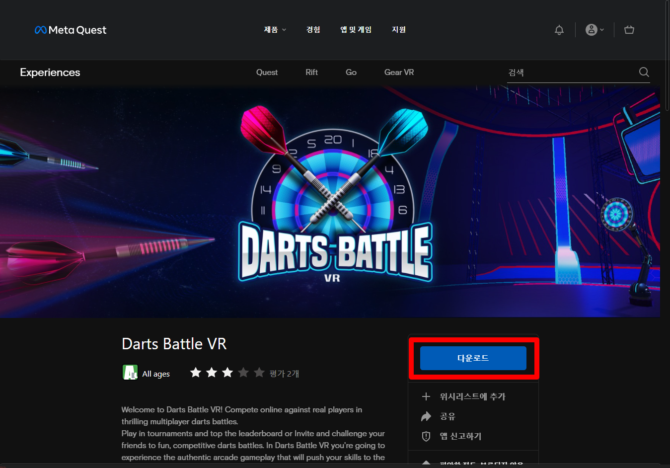 "Darts Battle VR" 게임페이지에 있는 [다운로드] 버튼 클릭합니다.