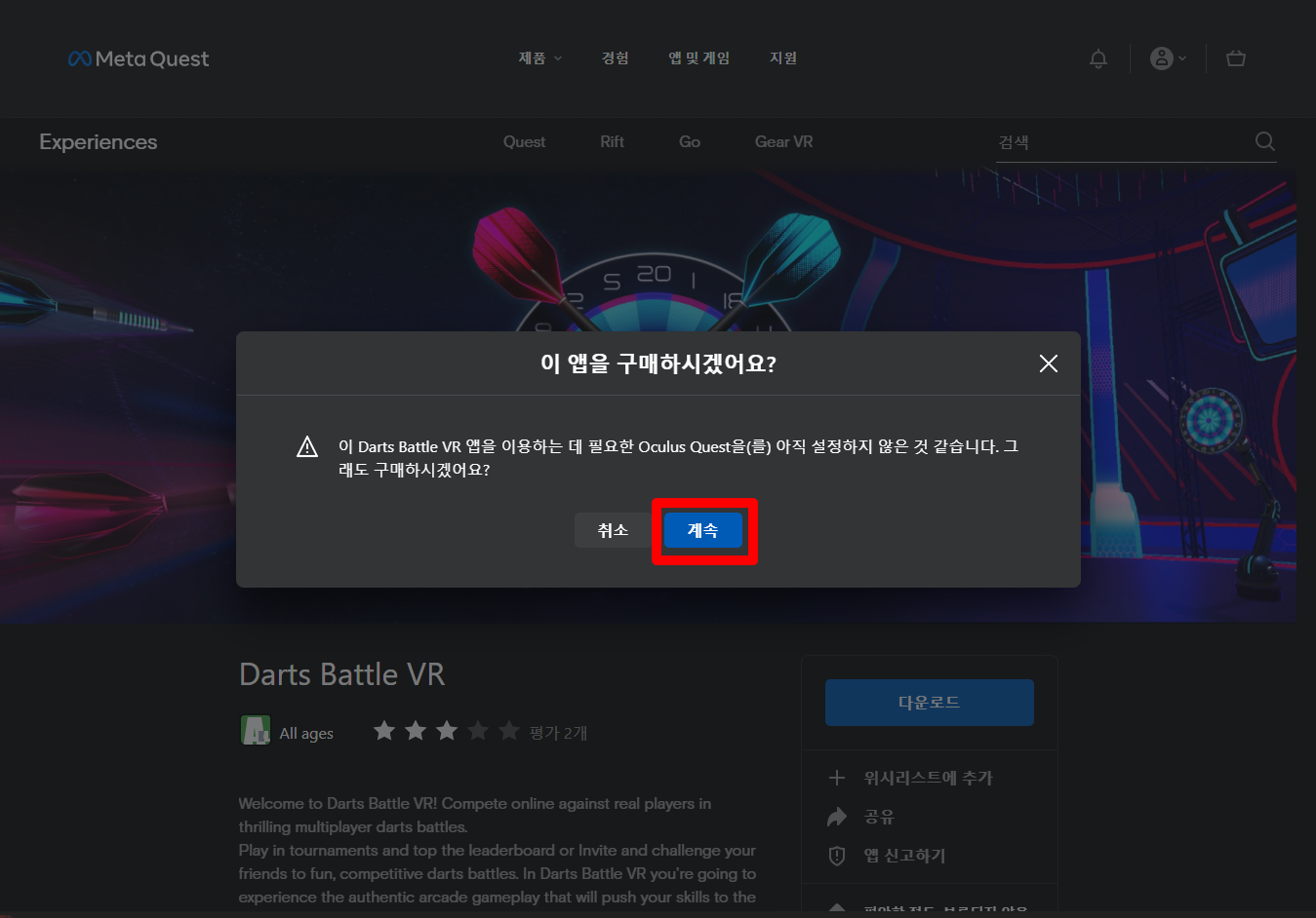 "Darts Battle VR" 구매확인창이 나오면 [계속] 클릭합니다.