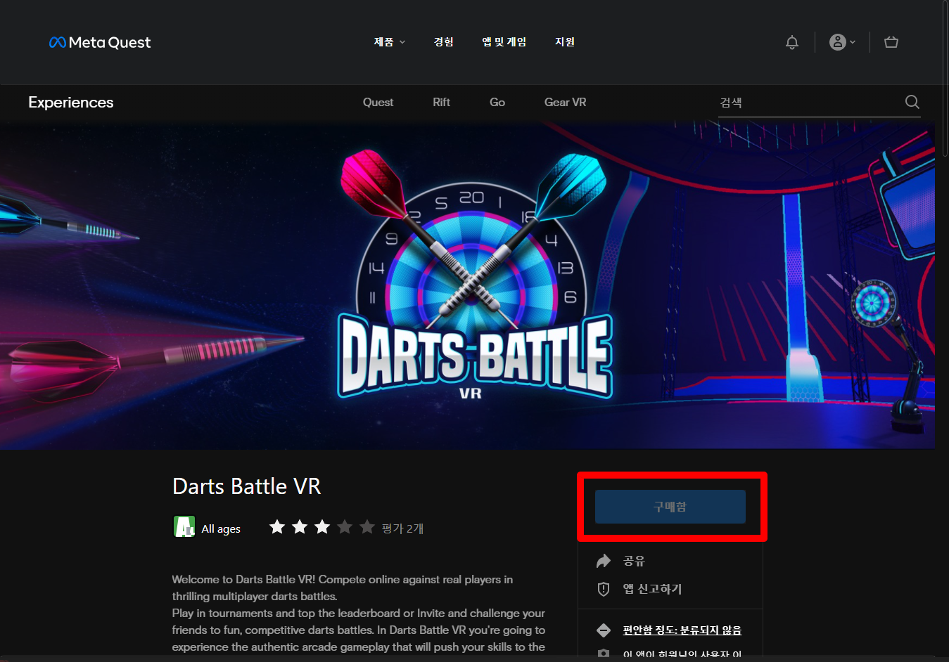 "Darts Battle VR" 게임 페이지를 보면 "구매함"으로 표시되어 있어 가지고 있는 것 확인할 수 있습니다.