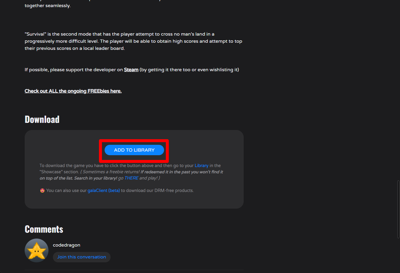"Soldiers Lost Forever (1914-1918)" 게임 페이지를 내려 [ADD TO LIBRARY]를 클릭합니다.