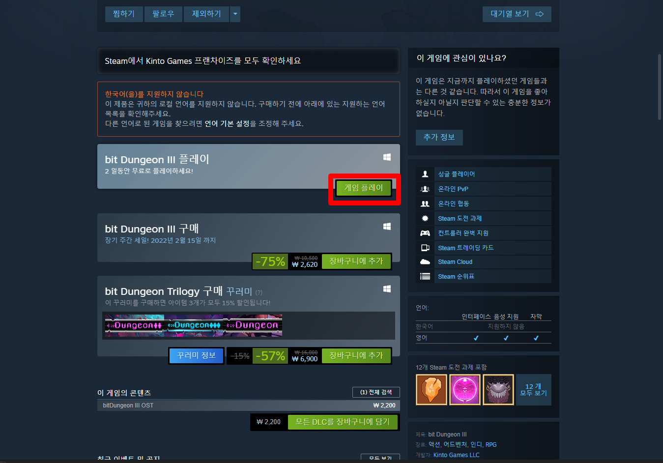 "bit Dungeon III" 게임페이지를 조금 내려서 [게임 플레이] 버튼을 클릭하면 됩니다.