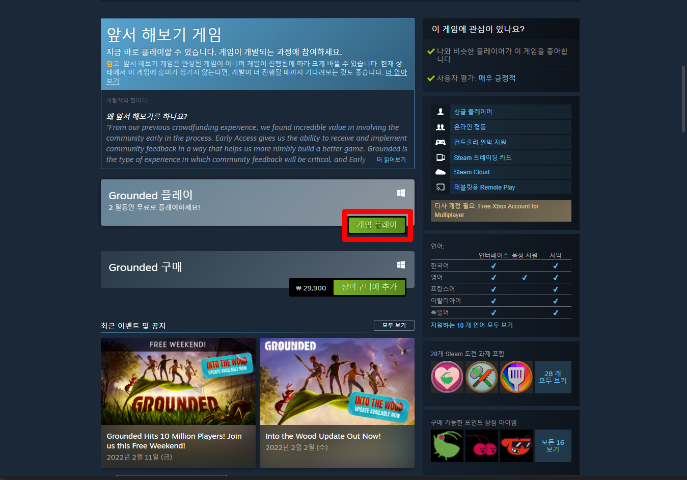 "Grounded" 게임페이지를 조금 내려서 [게임 플레이] 버튼을 클릭하면 됩니다.