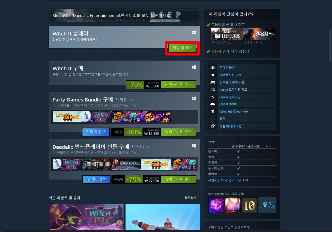 "Witch It" 게임페이지를 조금 내려서 [게임 플레이] 버튼을 클릭하면 됩니다.