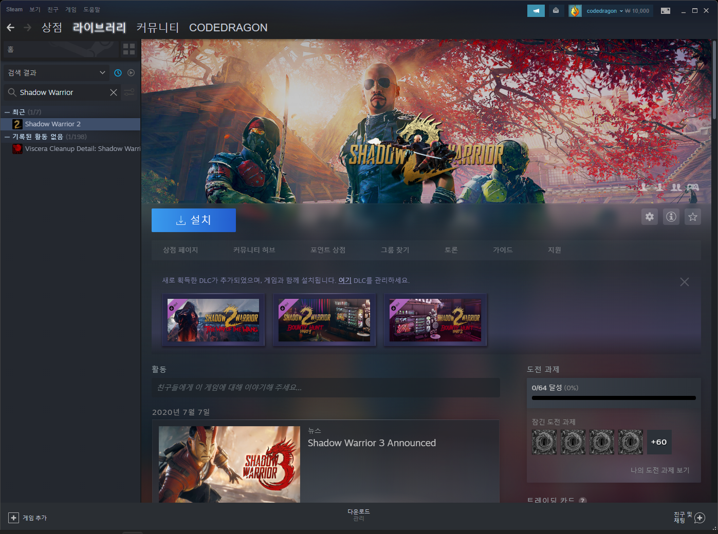 나의 게임 라이브러리에서 등록한 "Shadow Warrior 2" 항목을 확인할 수 있습니다