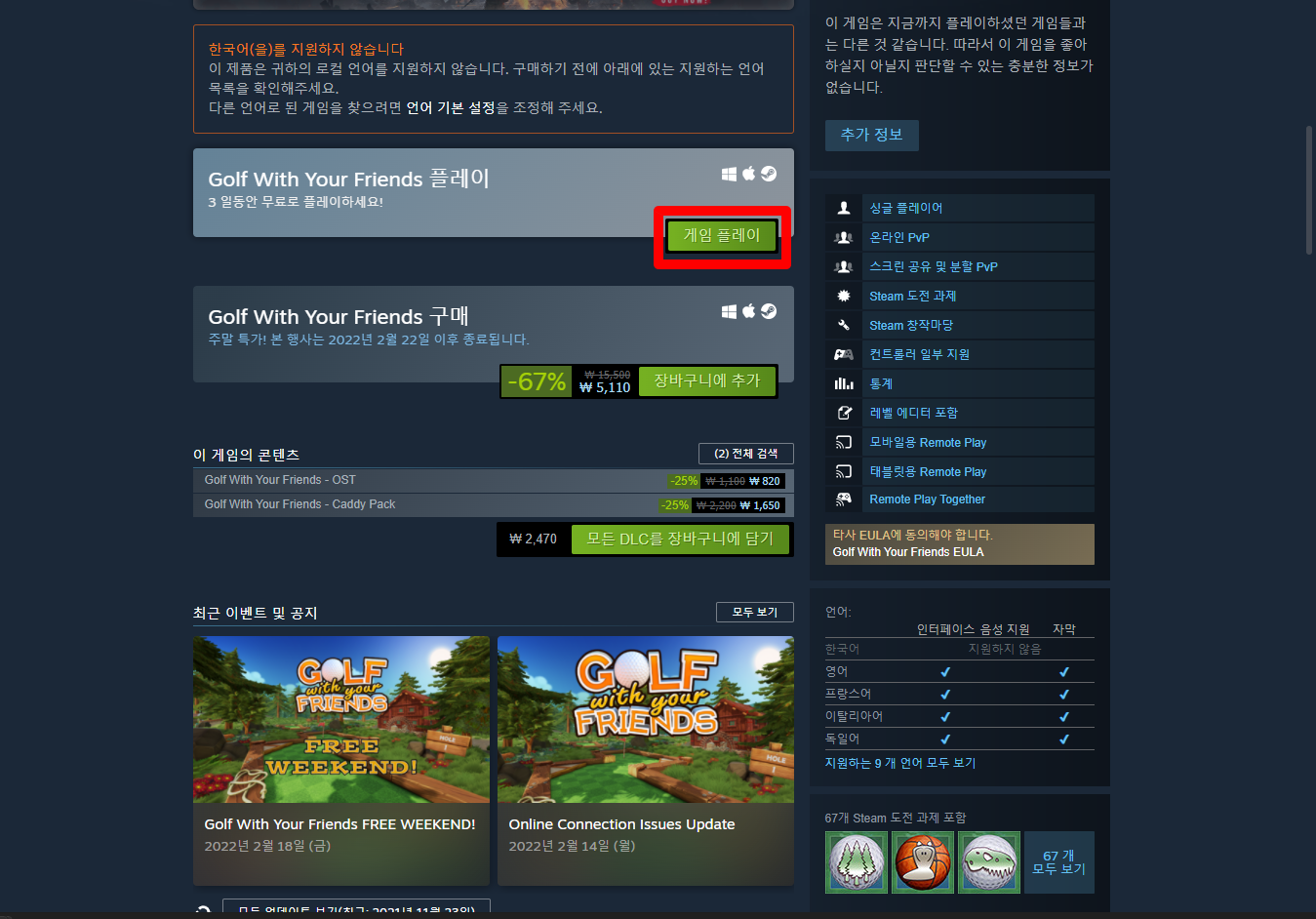 "Golf With Your Friends" 게임페이지를 조금 내려서 [게임 플레이] 버튼을 클릭하면 됩니다.
