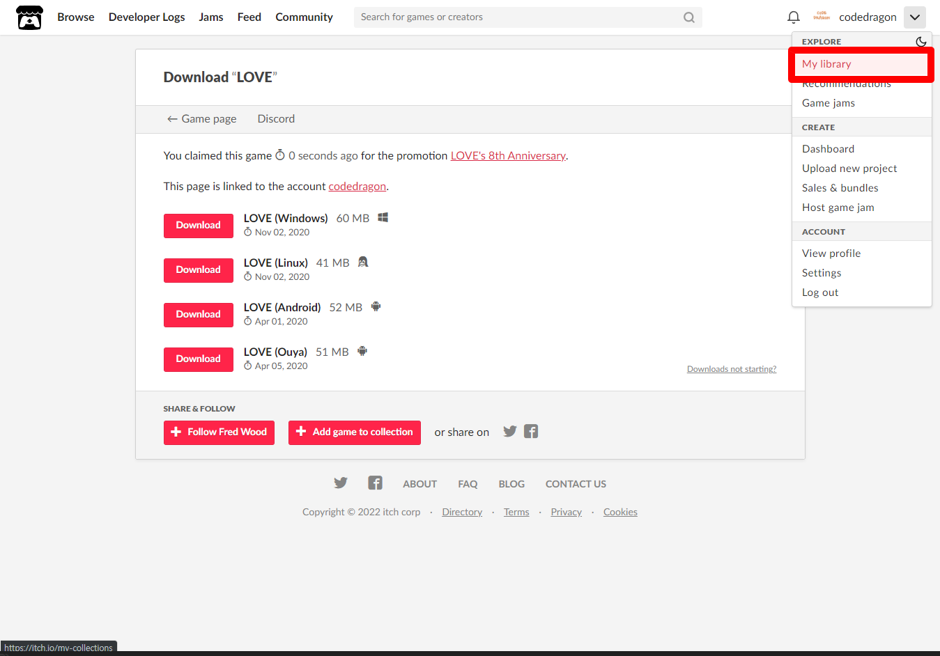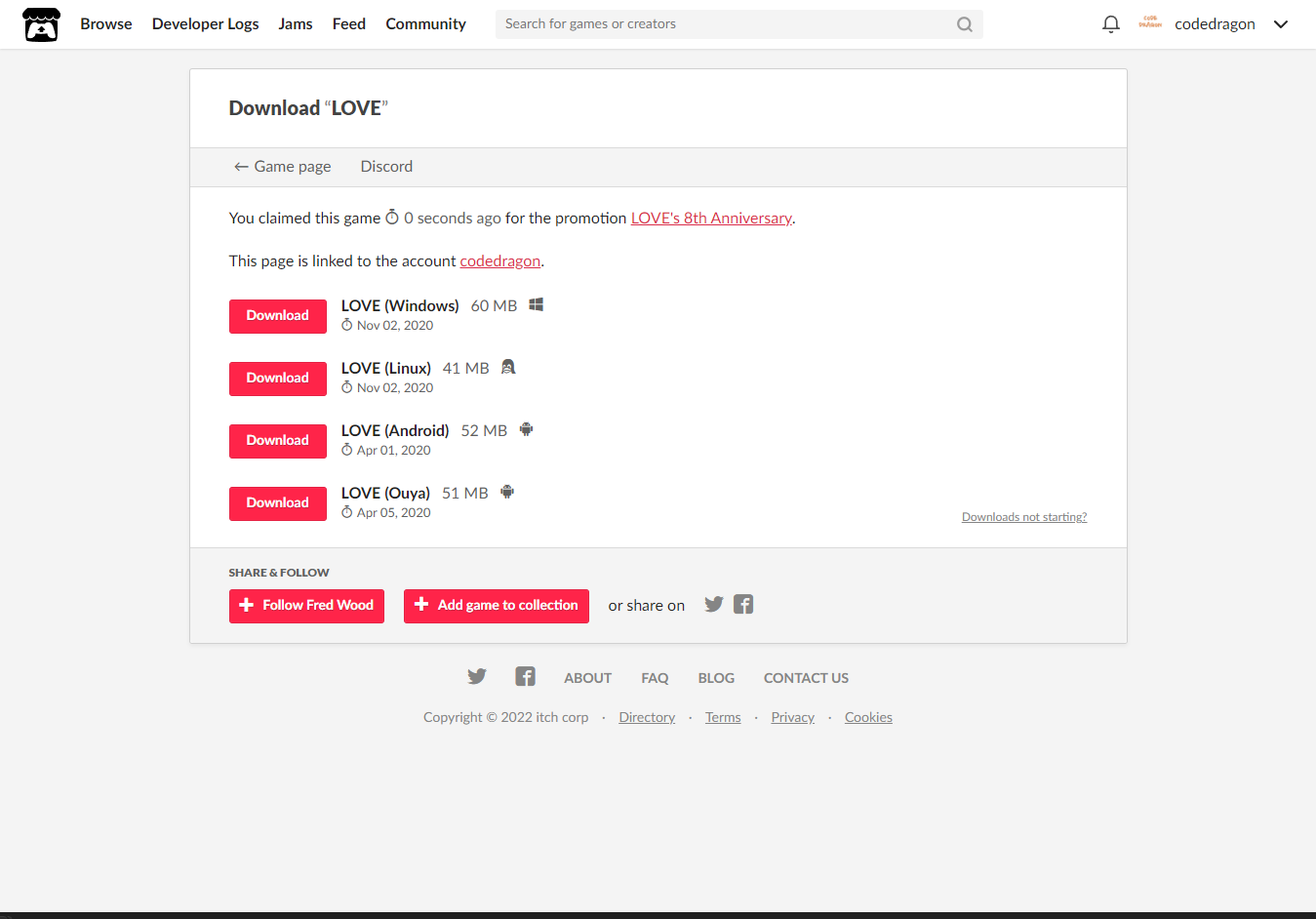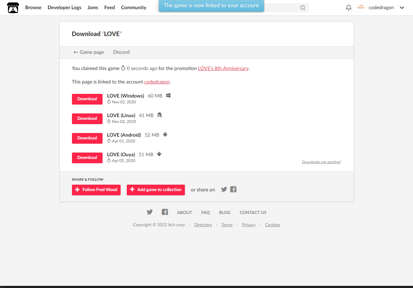 [Claim game]을 클릭하면 "LOVE" 게임이 나의 게임 라이브러리에 추가되고 설치파일을 다운받을 수 있는 페이지로 이동됩니다.