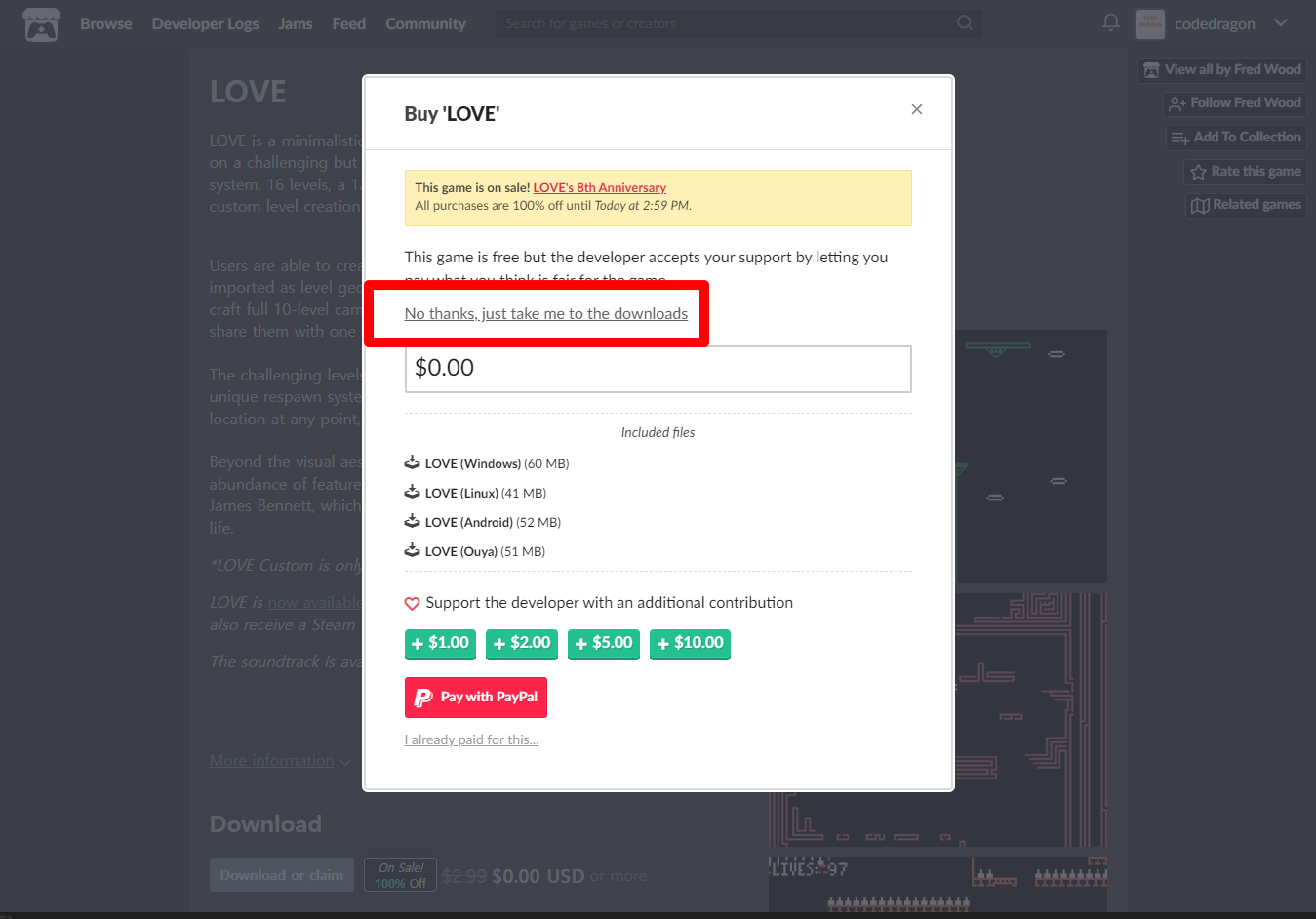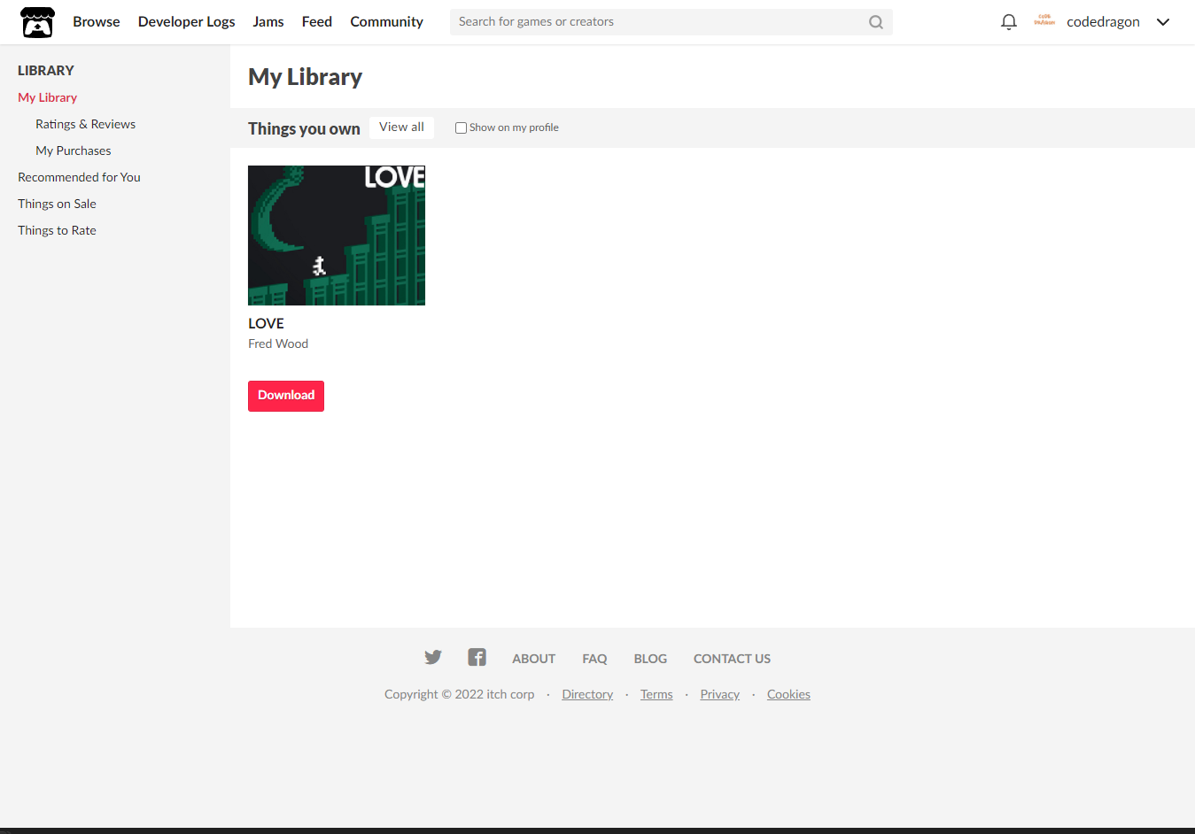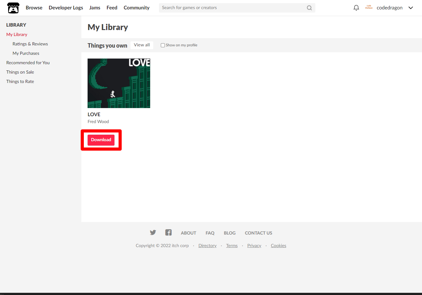 [Claim game]을 클릭하면 "LOVE" 게임이 나의 게임 라이브러리에 추가되고 설치파일을 다운받을 수 있는 페이지로 이동됩니다.