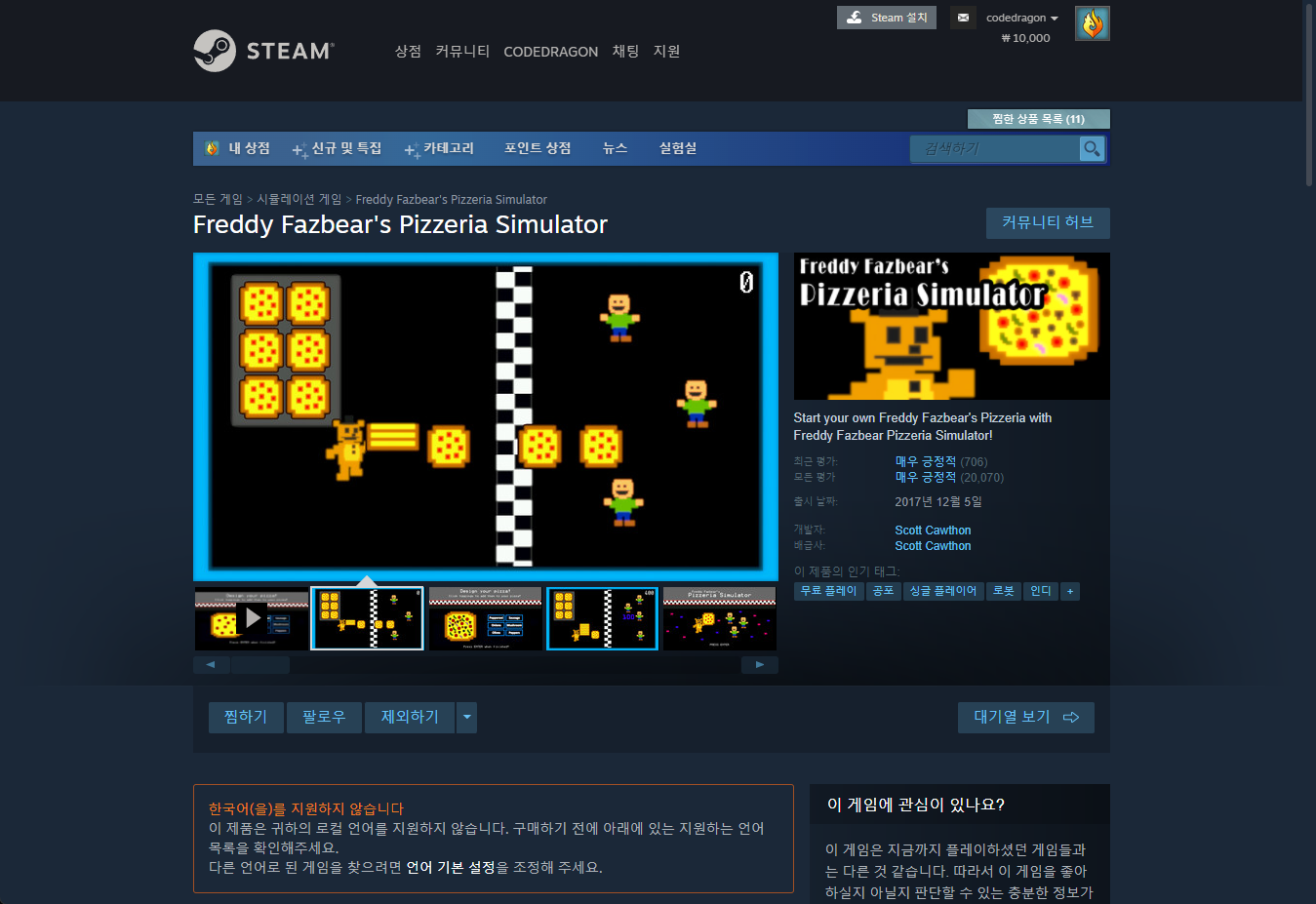 "Freddy Fazbear's Pizzeria Simulator" 스팀 페이지 입니다.