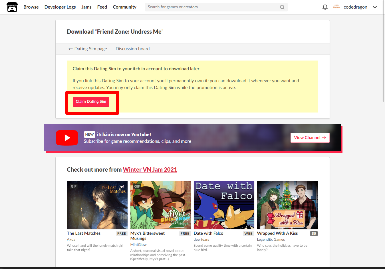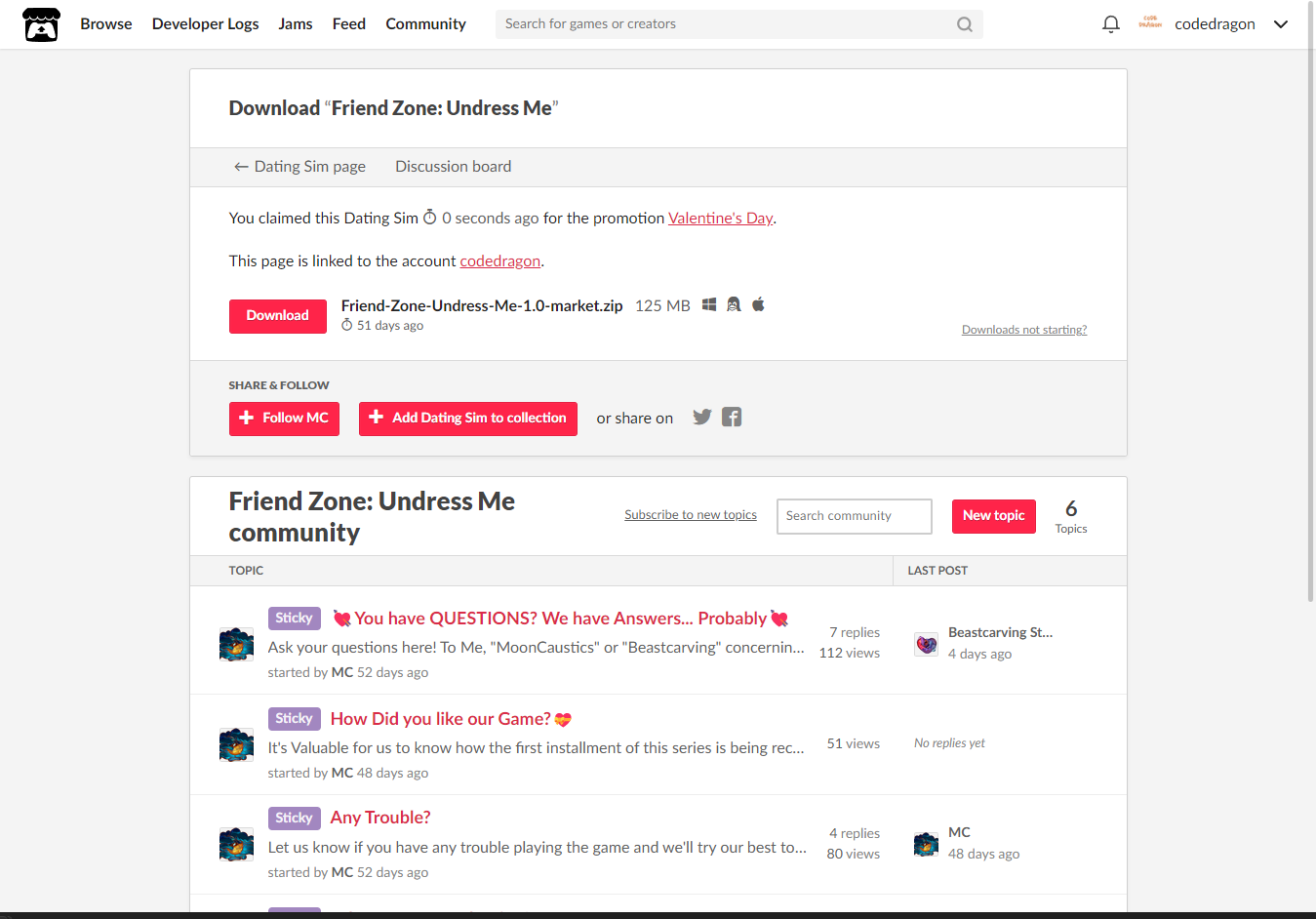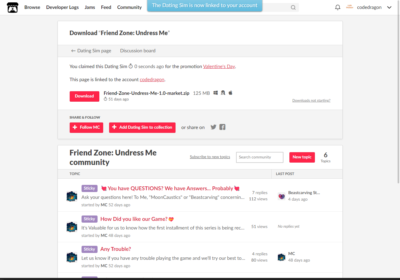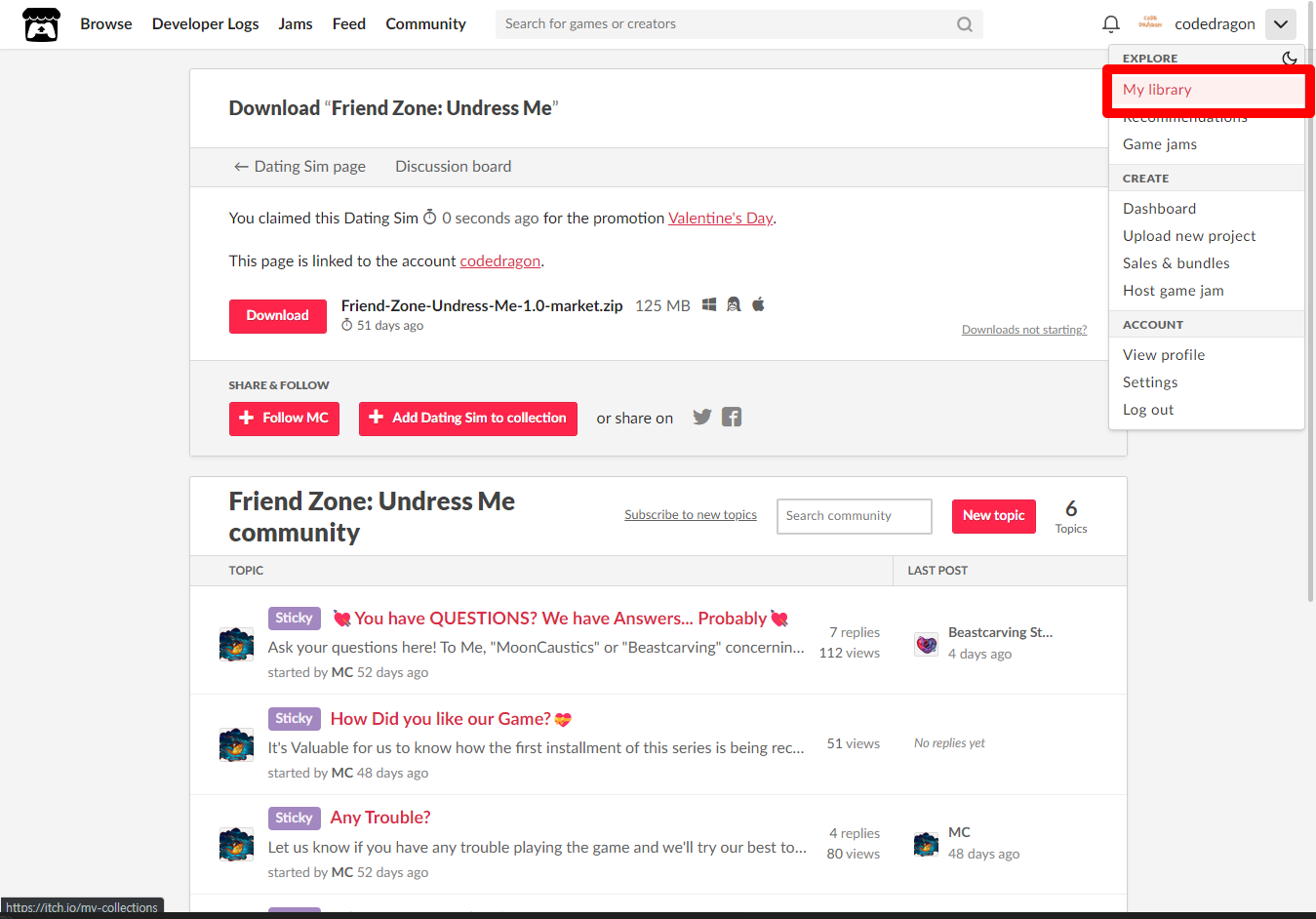 [Claim Dating Sim]을 클릭하면 "Friend Zone: Undress Me" 게임이 나의 게임 라이브러리에 추가되고 설치파일을 다운받을 수 있는 페이지로 이동됩니다.