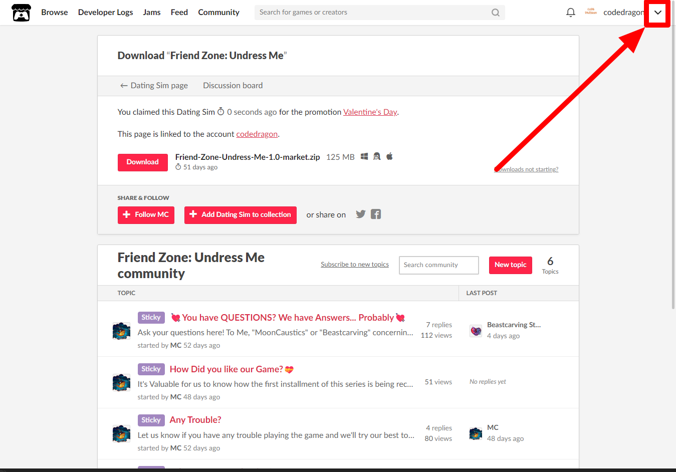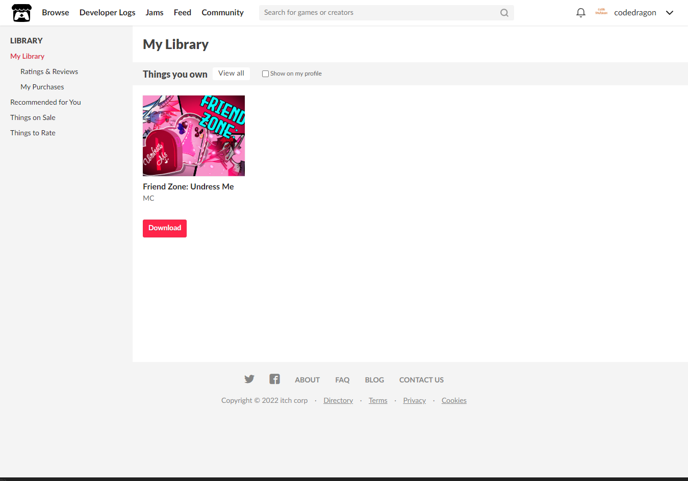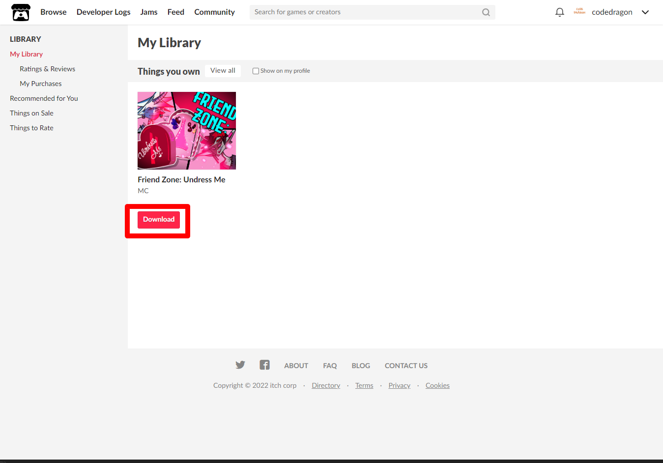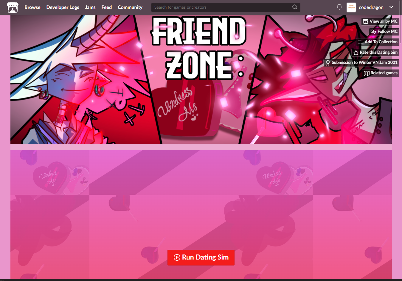 [Claim Dating Sim]을 클릭하면 "Friend Zone: Undress Me" 게임이 나의 게임 라이브러리에 추가되고 설치파일을 다운받을 수 있는 페이지로 이동됩니다.