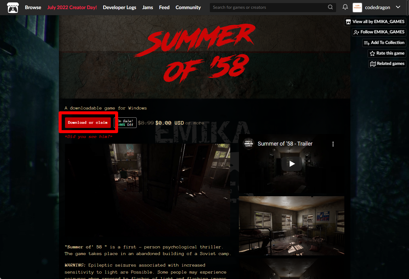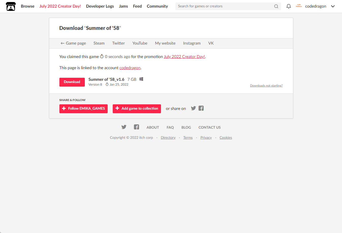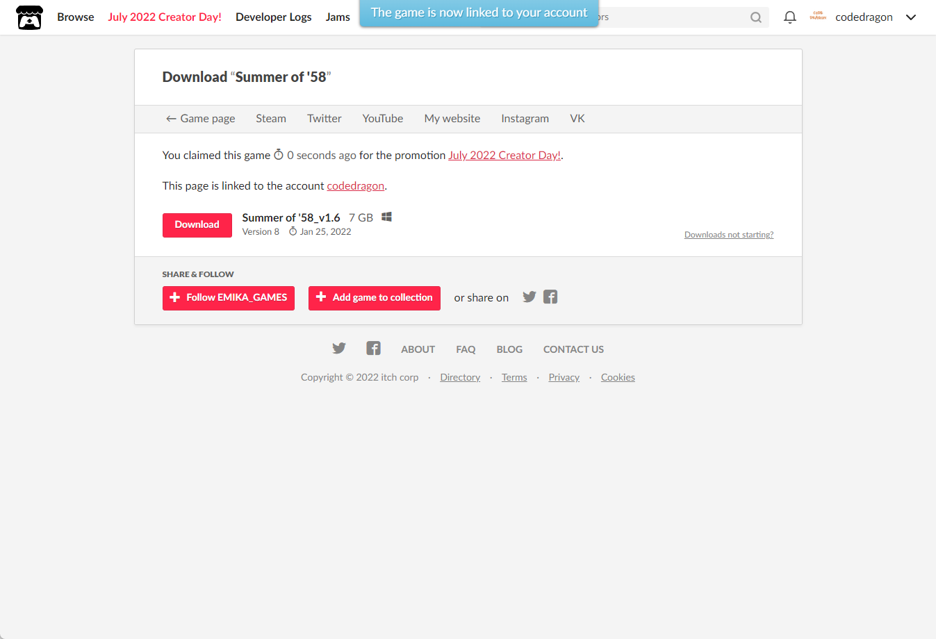 [Claim game]을 클릭하면 "Summer of '58" 게임이 나의 게임 라이브러리에 추가되고 설치파일을 다운받을 수 있는 페이지로 이동됩니다.