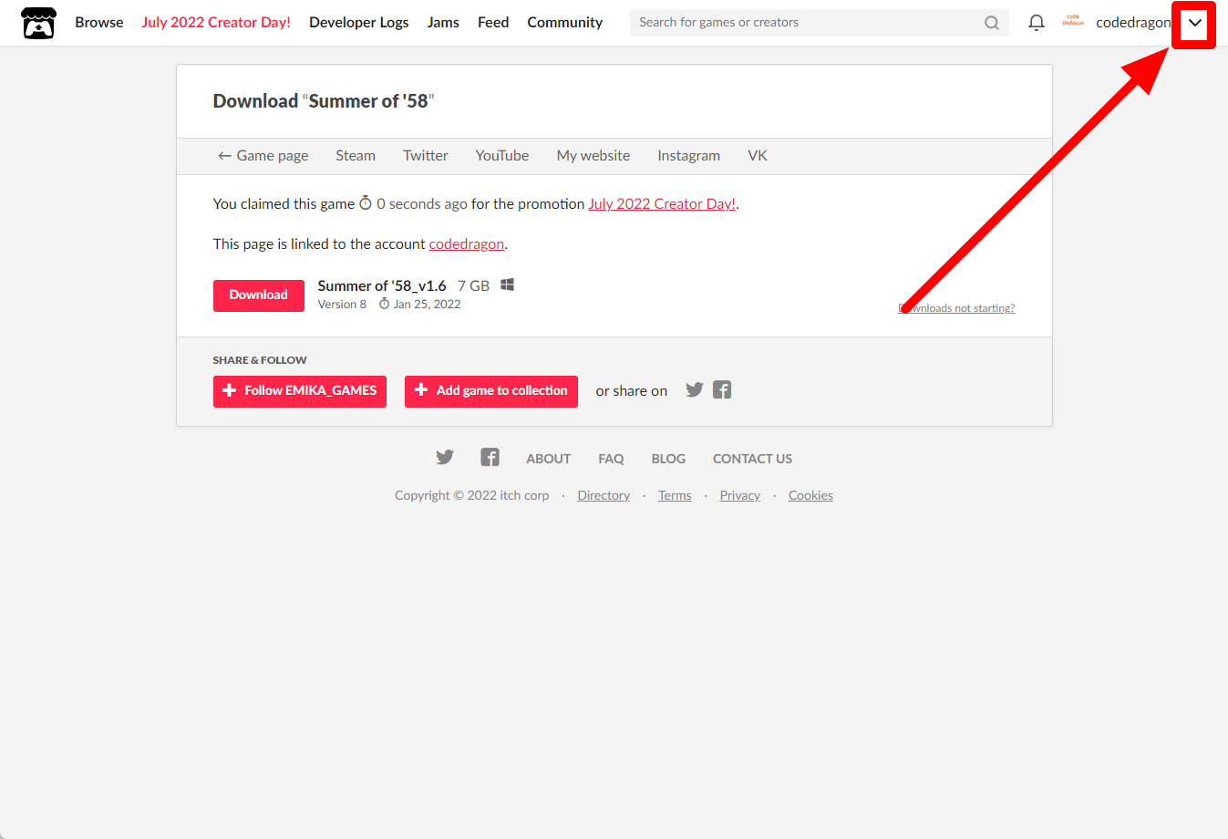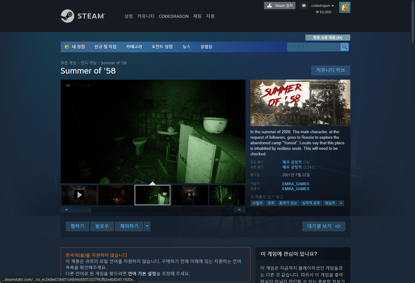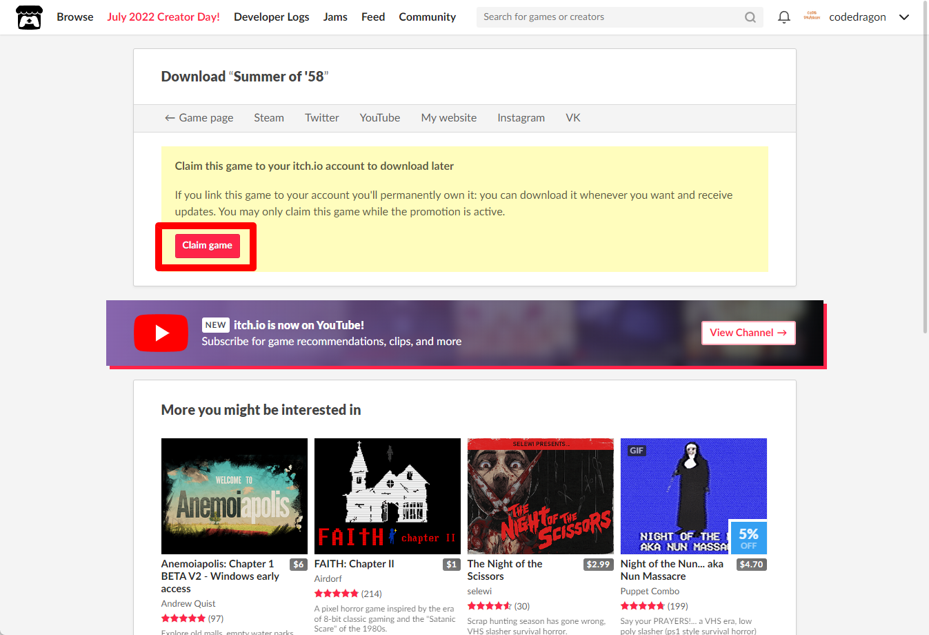 [Claim game]을 클릭하면 "Summer of '58" 게임이 나의 게임 라이브러리에 추가되고 설치파일을 다운받을 수 있는 페이지로 이동됩니다.