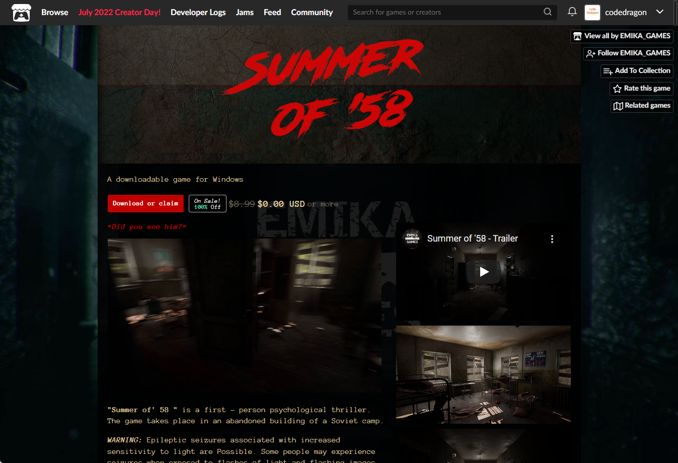 ₩9,500 -> ₩0(Free) Summer of '58 섬머 오브 '58 무료로 받기 영구소장 - itch.io 잇치 닷 아이오 한시적 무료 소장하기