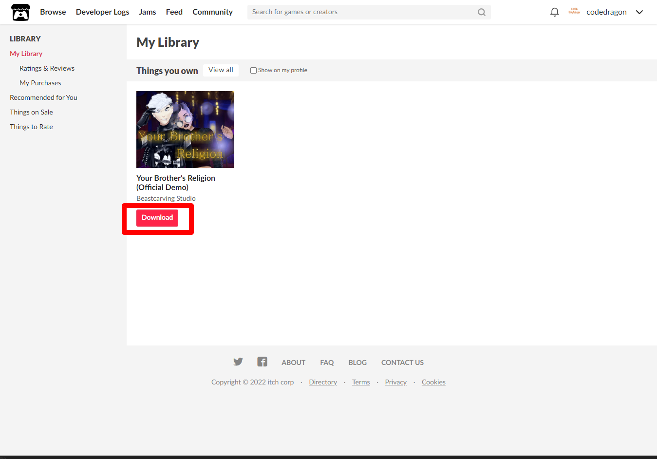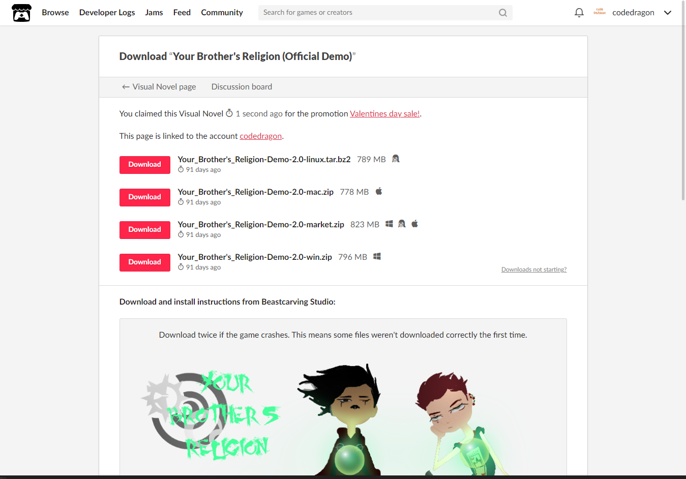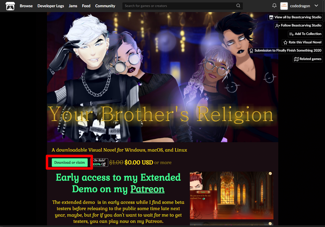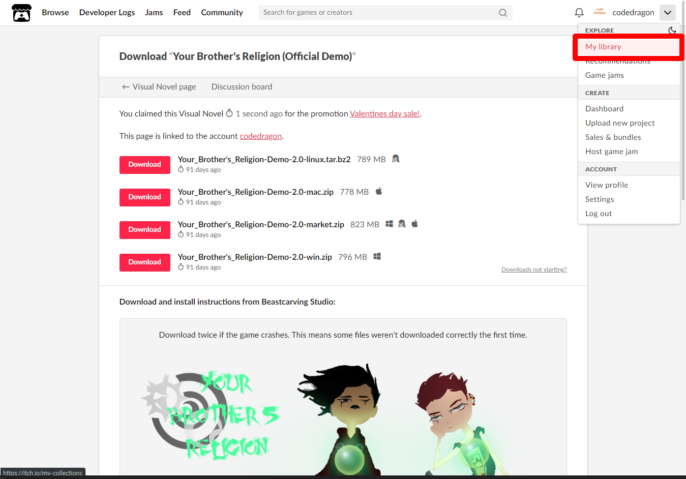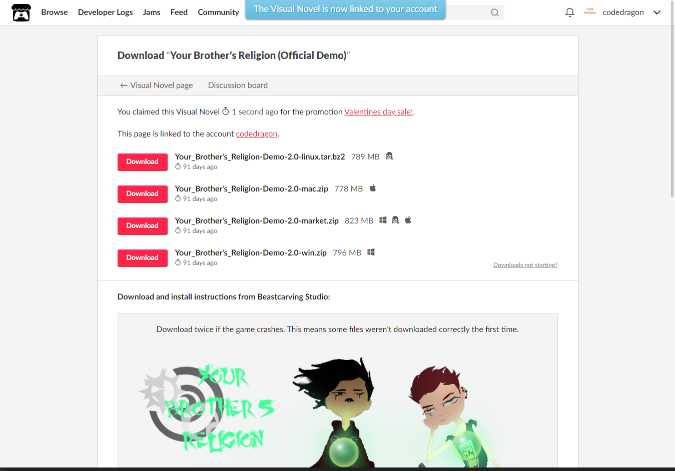 [Claim Visual Novel]을 클릭하면 "Your Brother's Religion (Official Demo)" 게임이 나의 게임 라이브러리에 추가되고 설치파일을 다운받을 수 있는 페이지로 이동됩니다.