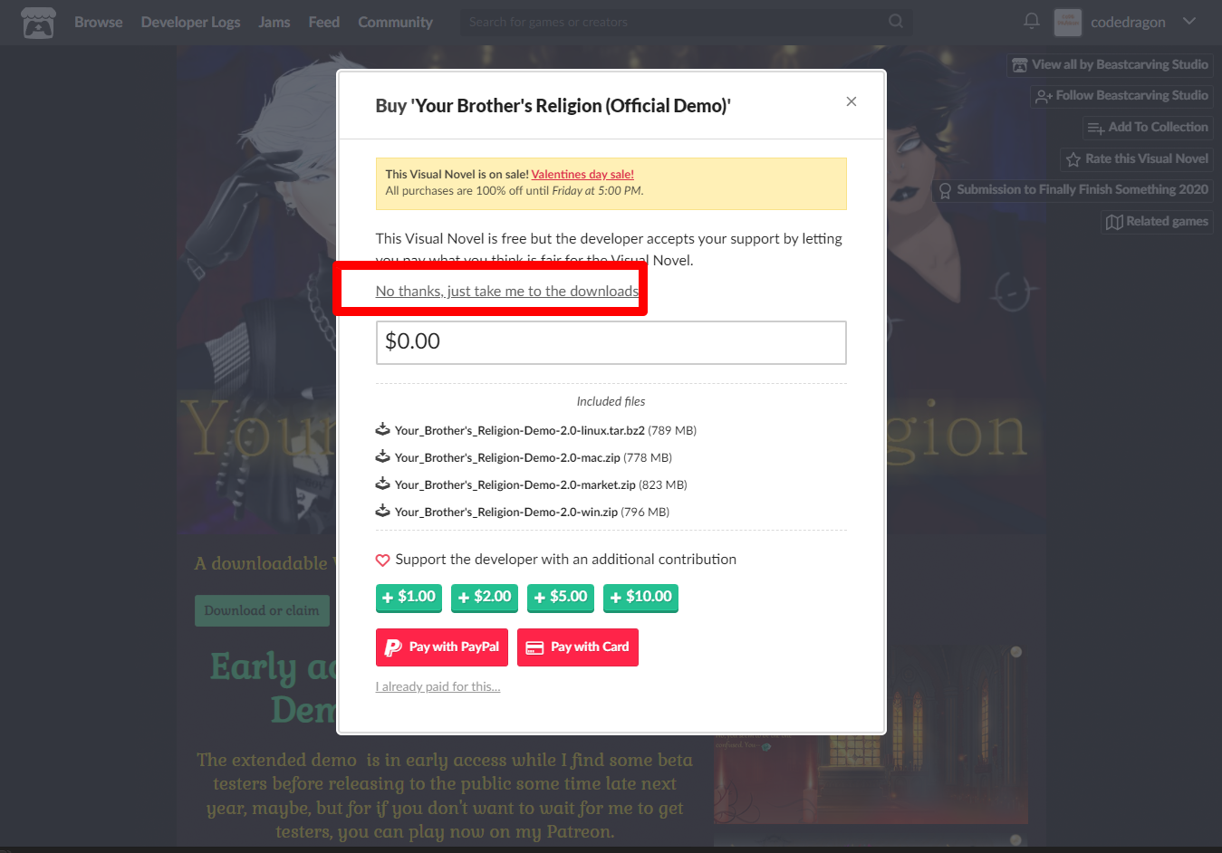 "Your Brother's Religion (Official Demo)" 페이지에 있는 [Download or claim]을 클릭합니다.