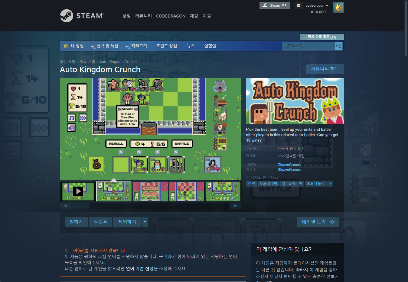 "Auto Kingdom Crunch" 스팀 페이지 입니다.