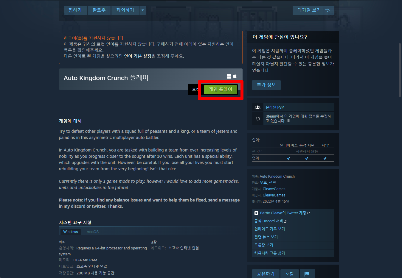 "Auto Kingdom Crunch" 페이지를 내려 [게임 플레이]를 클릭하면 됩니다.