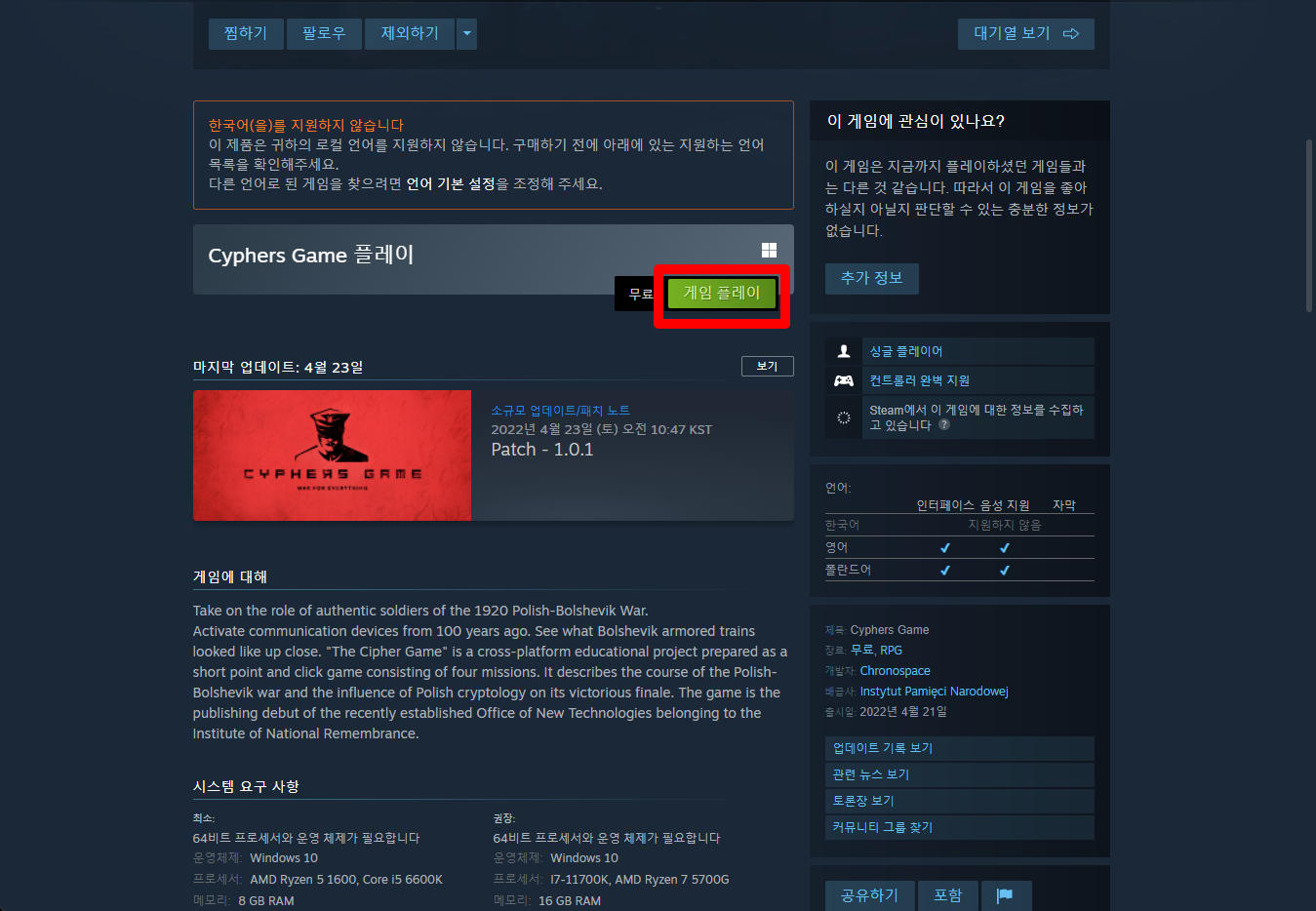 "Cyphers Game" 페이지를 내려 [게임 플레이]를 클릭하면 됩니다.