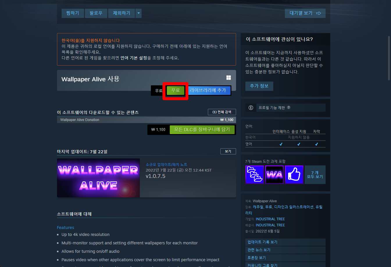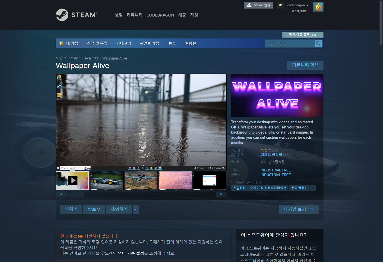 "Wallpaper Alive" 스팀 페이지 입니다.