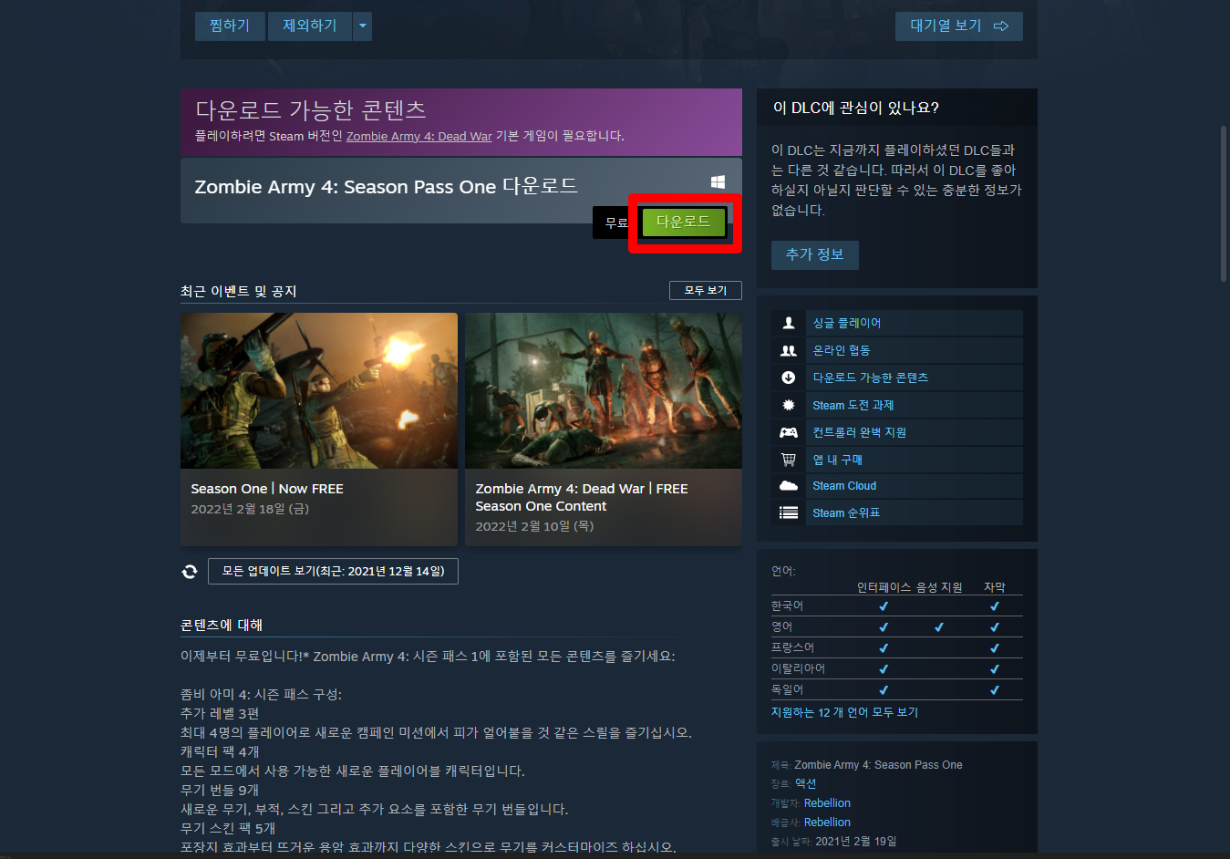 "Zombie Army 4: Season Pass One" 게임페이지를 조금 내려준 후 [다운로드] 버튼을 클릭하면 게임라이브러리에 추가됩니다.