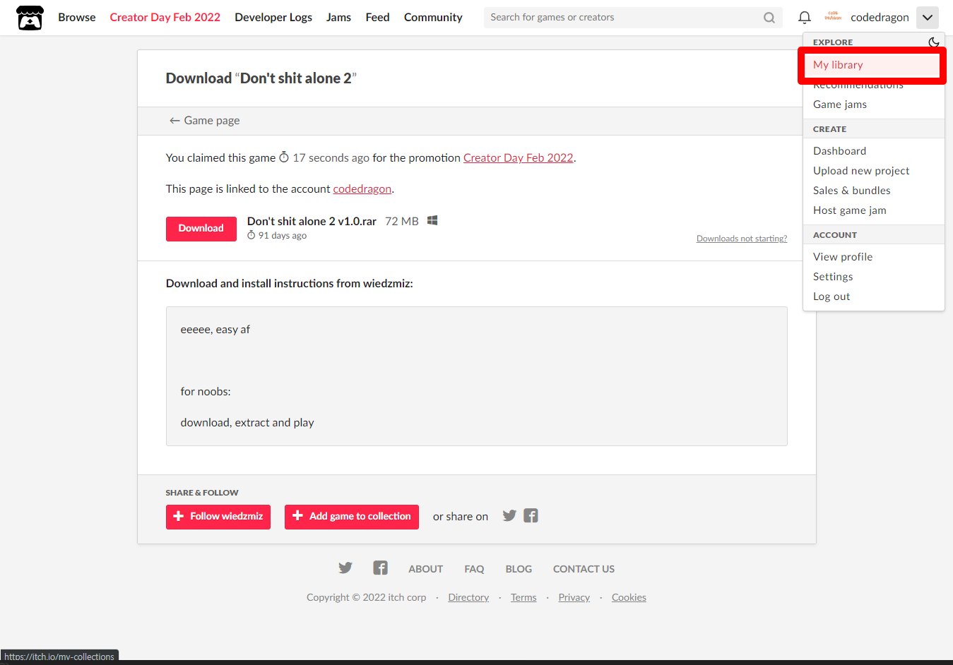 [Claim game]을 클릭하면 "Don't shit alone 2" 게임이 나의 게임 라이브러리에 추가되고 설치파일을 다운받을 수 있는 페이지로 이동됩니다.