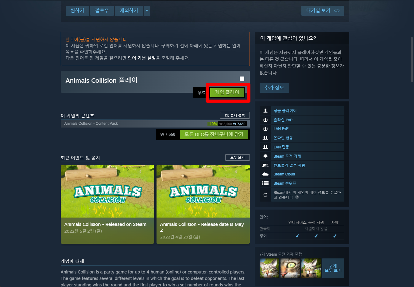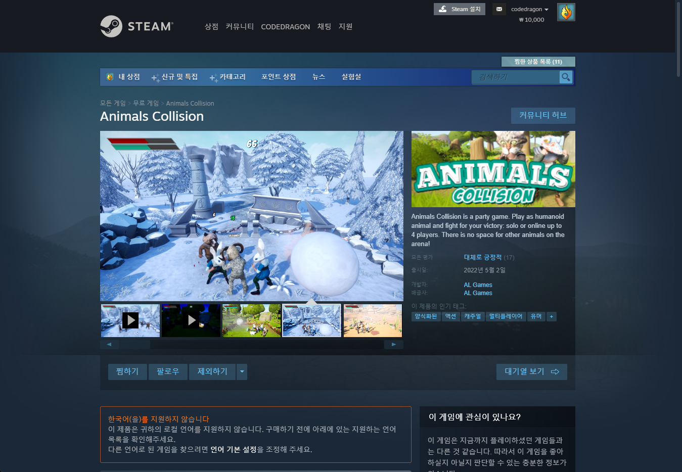 "Animals Collision" 스팀 페이지 입니다.