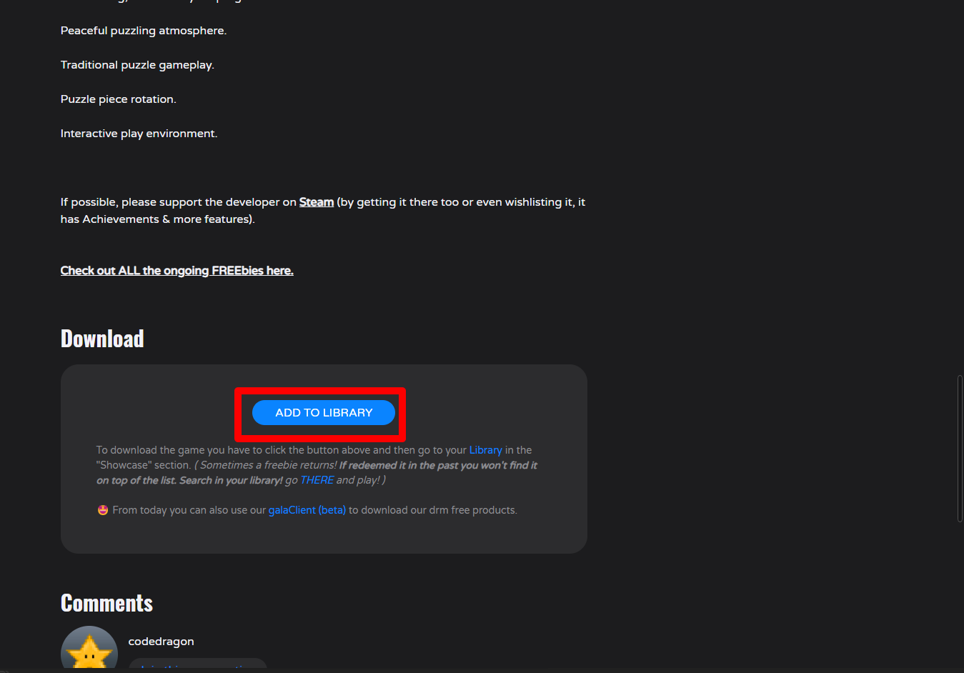 "Pixel Puzzles 2: Paintings" 게임 페이지를 내려 [ADD TO LIBRARY]를 클릭합니다.