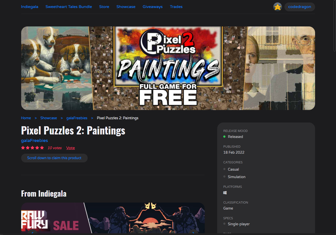 ₩5,500 -> ₩ 0(Free) Pixel Puzzles 2: Paintings 무료 (재배포) - 인디갈라 indiegala 무료 소장 기회 기간한정 indiegala FREE GAME, Limited time