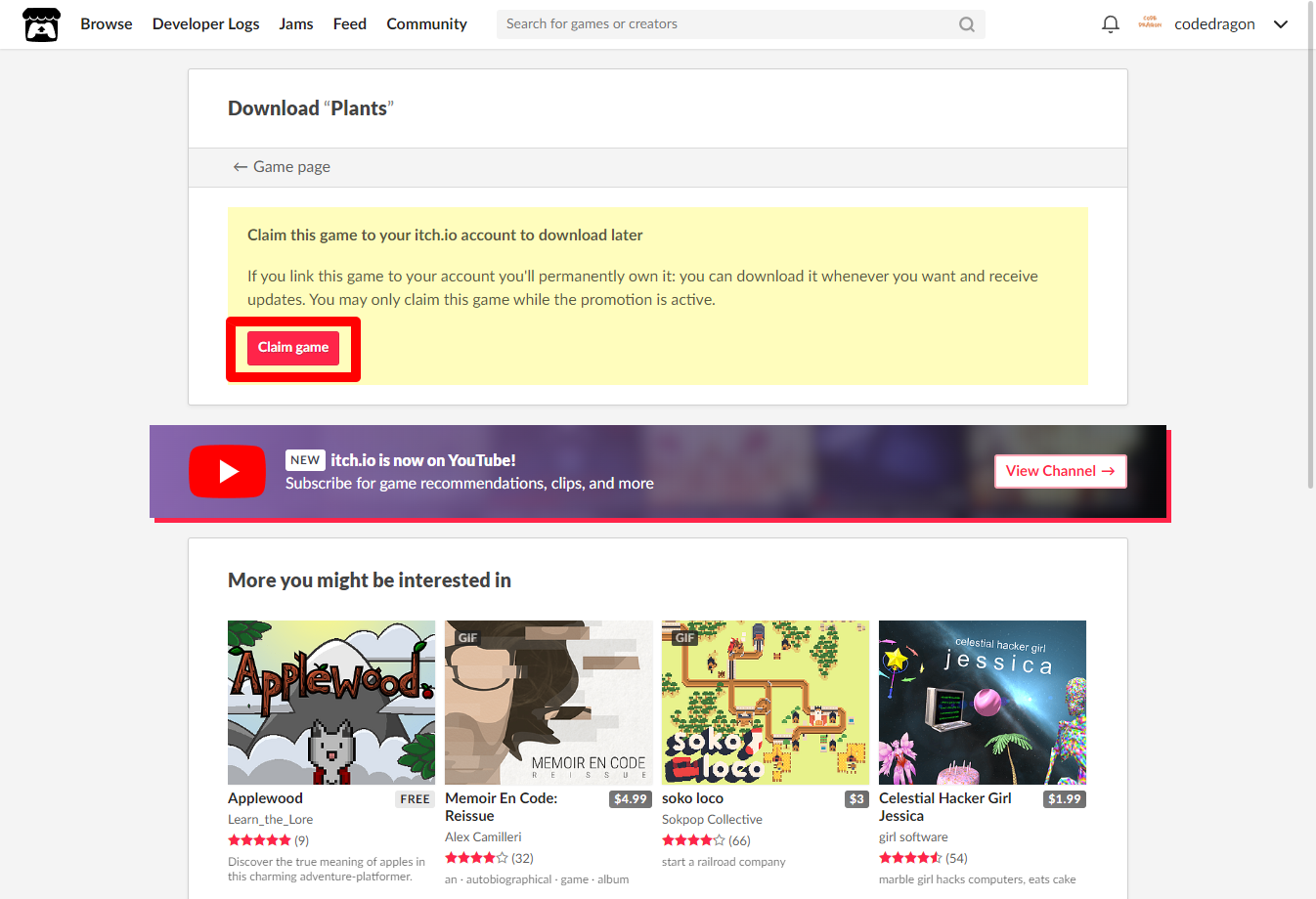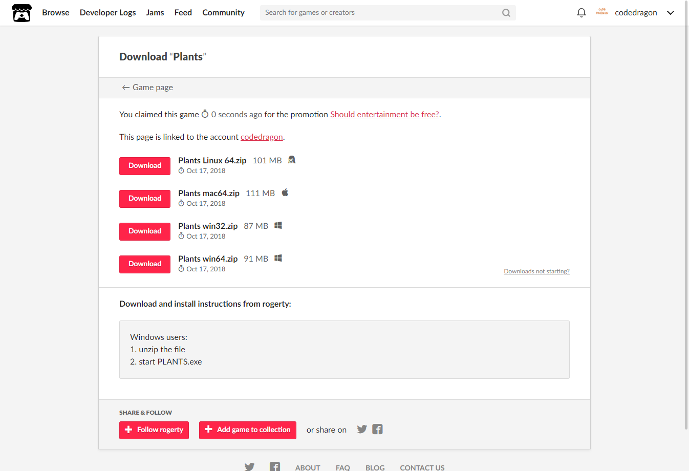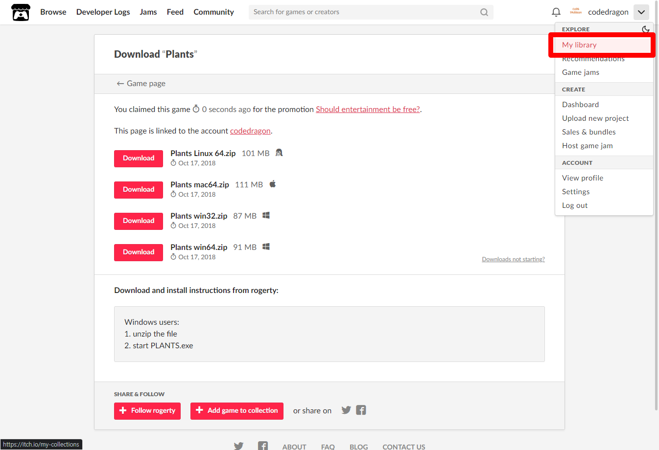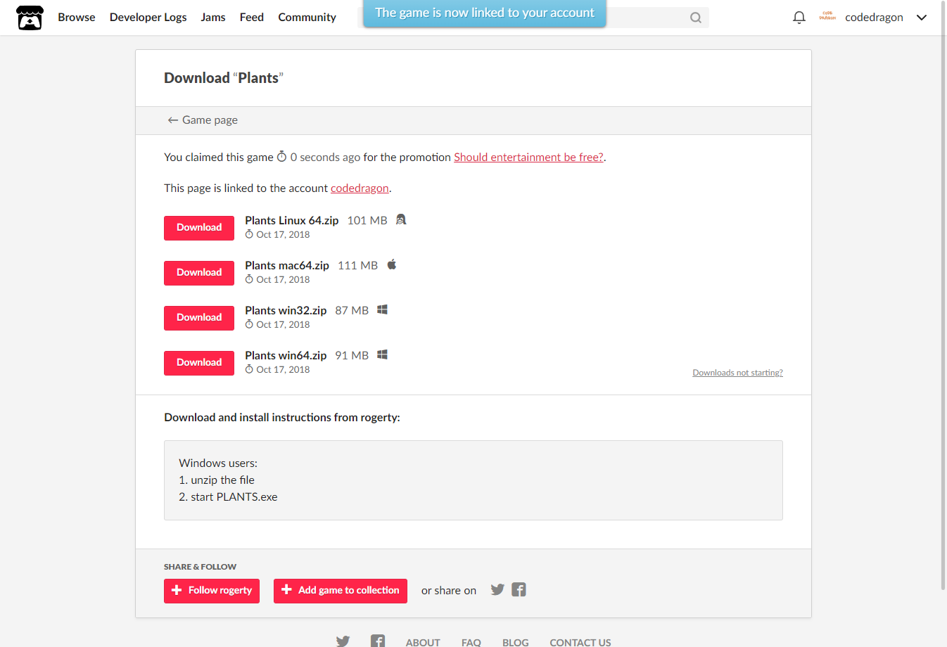 [Claim game]을 클릭하면 "Plants" 게임이 나의 게임 라이브러리에 추가되고 설치파일을 다운받을 수 있는 페이지로 이동됩니다.